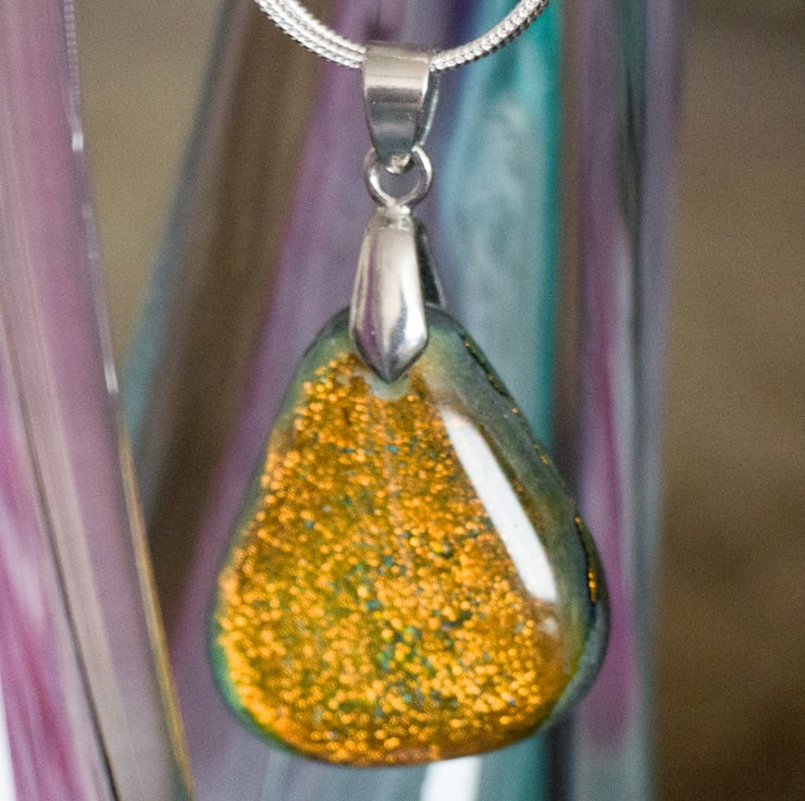 This triangular pendant, which is made from 2 layers of hand-cut art glass, is approximately 2.7 cm tall and 2.2 cm wide. After being treated to a session in the kiln, it was carefully drilled and fitted with a silver-coloured metal swivel bail. It is strung from a sterling silver chain. It will be shipped in a small presentation box.