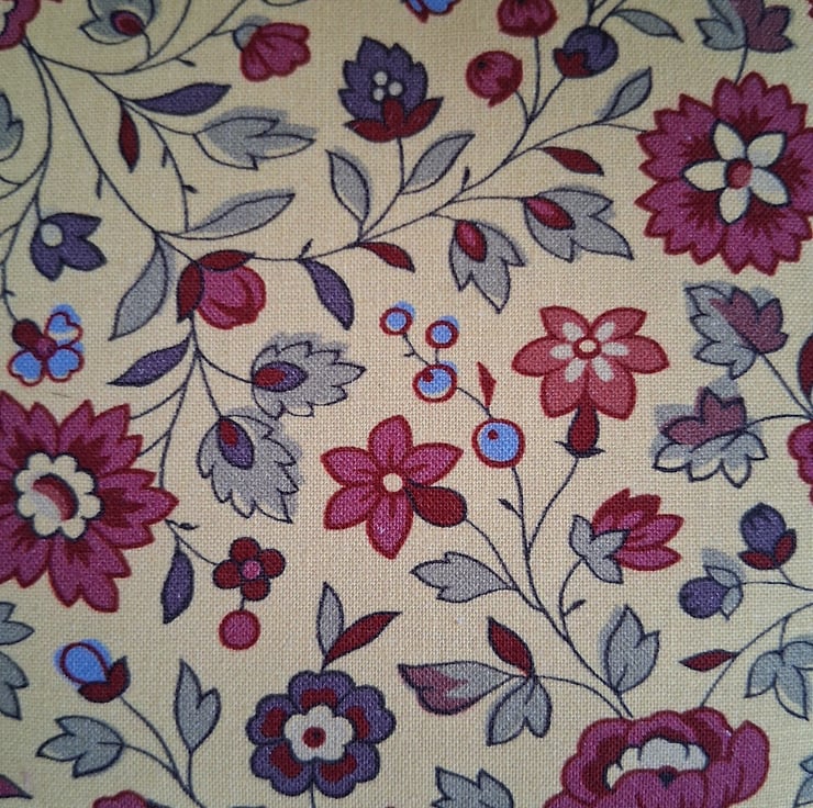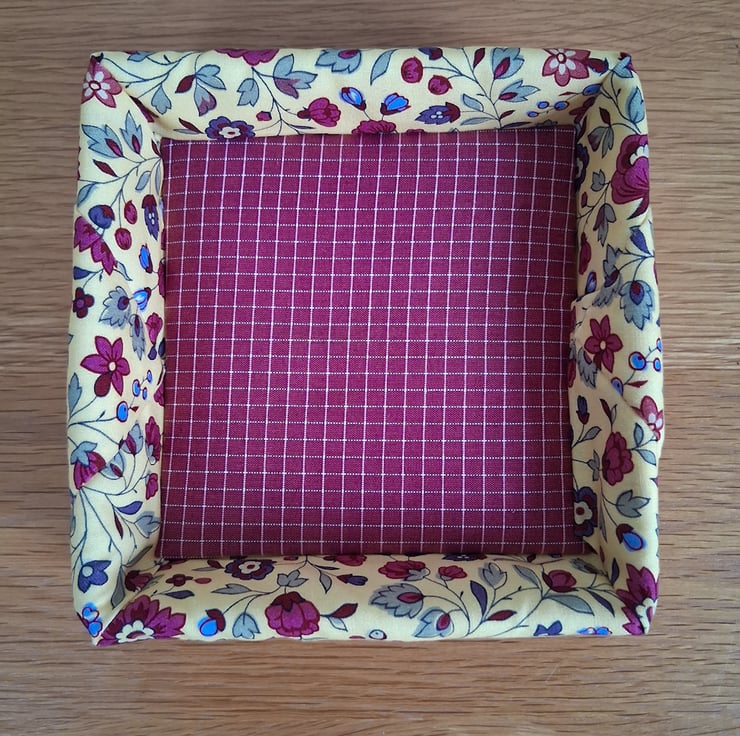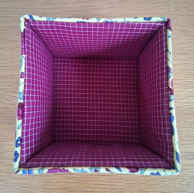The exterior is covered with a lovely printed dark yellow modern floral design fabric and the interior surfaces are covered with a co-ordinating burgundy checked fabric. All fabrics are 100% cotton and all surfaces apart from the base are padded, which gives a luxuriously soft texture.