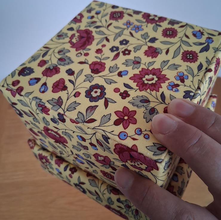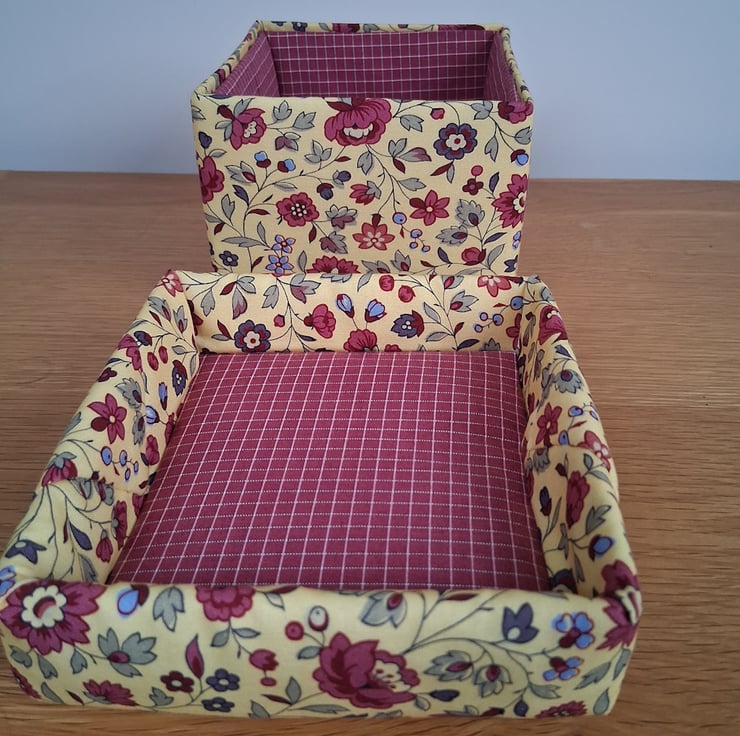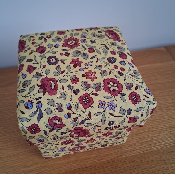 Decorative Yellow and Burgundy floral fabric covered trinket box, fully lined and padded with a removable lid. Entirely handmade, one of a kind and unique.