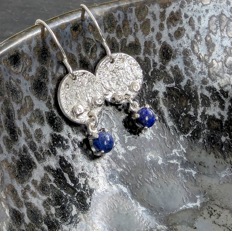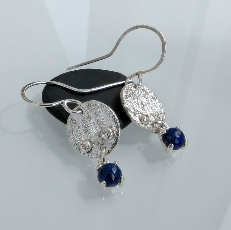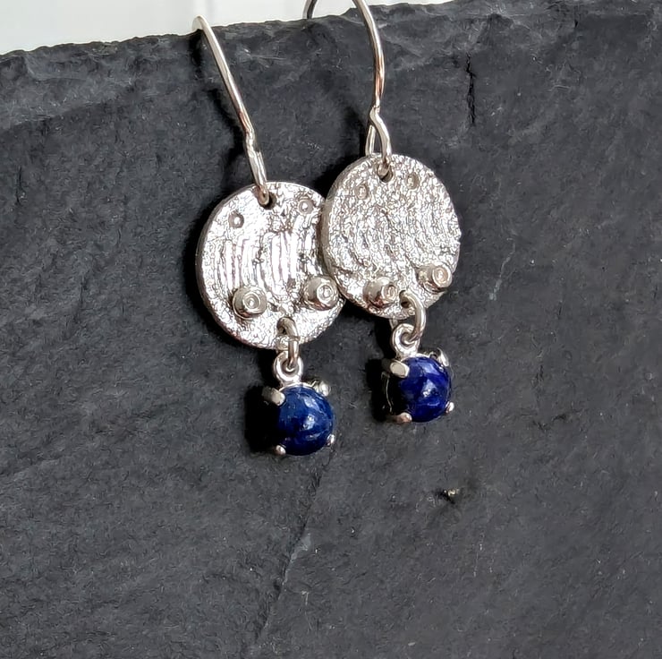 Little 4 mm cabochon cut Lapis Lazuli gemstones dangle on sterling silver claw sets