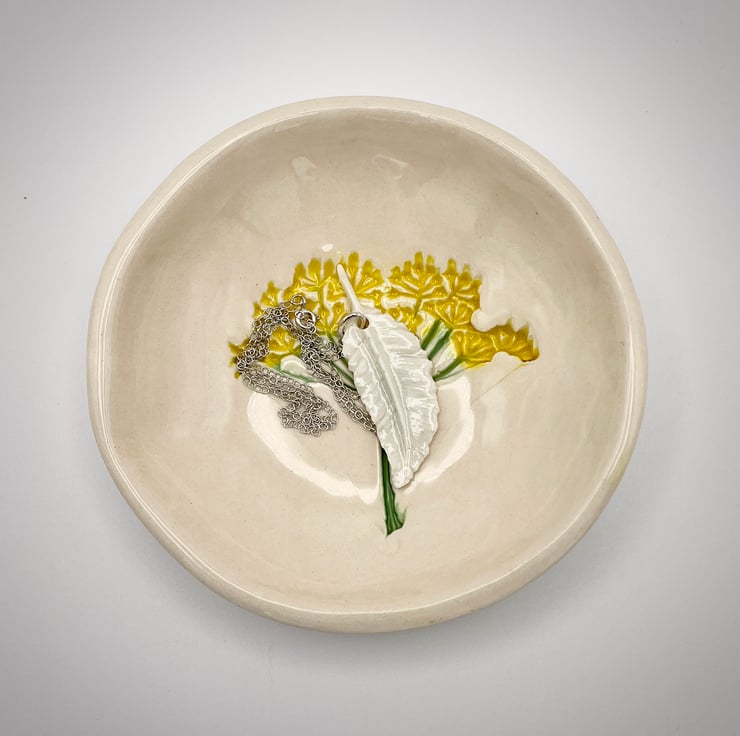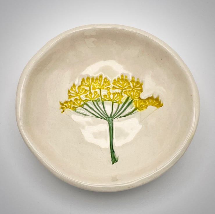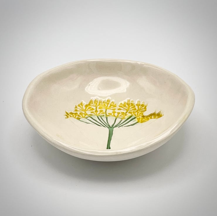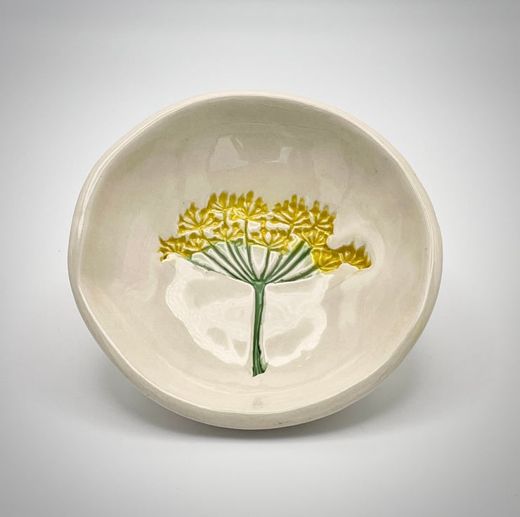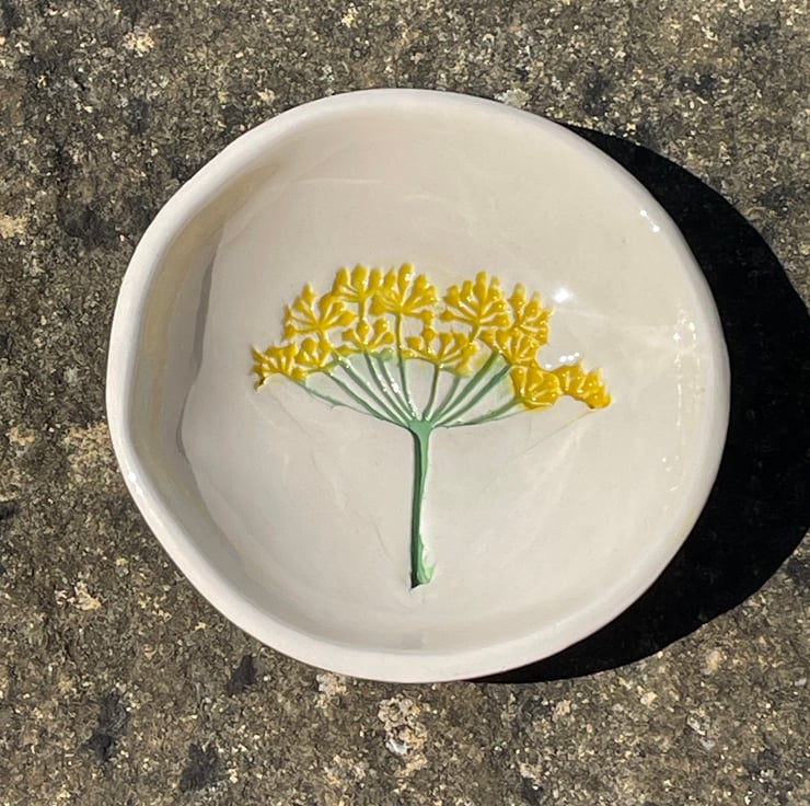 This is my ceramic dish with an embossed cow parsley design, it's perfect for jewellery, trinkets or little treasures.