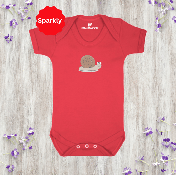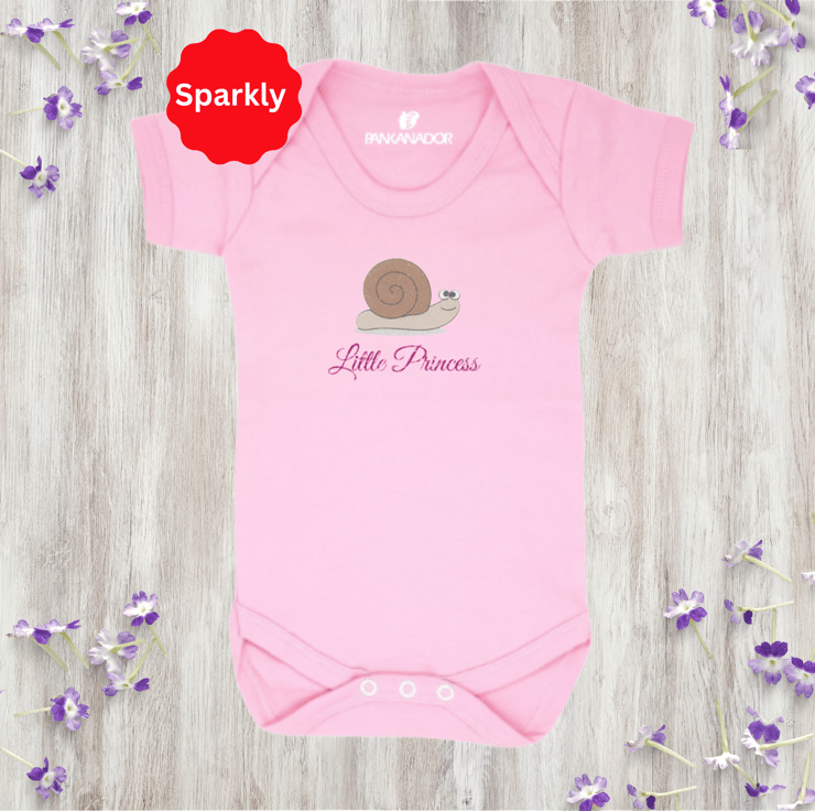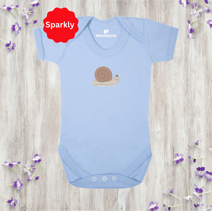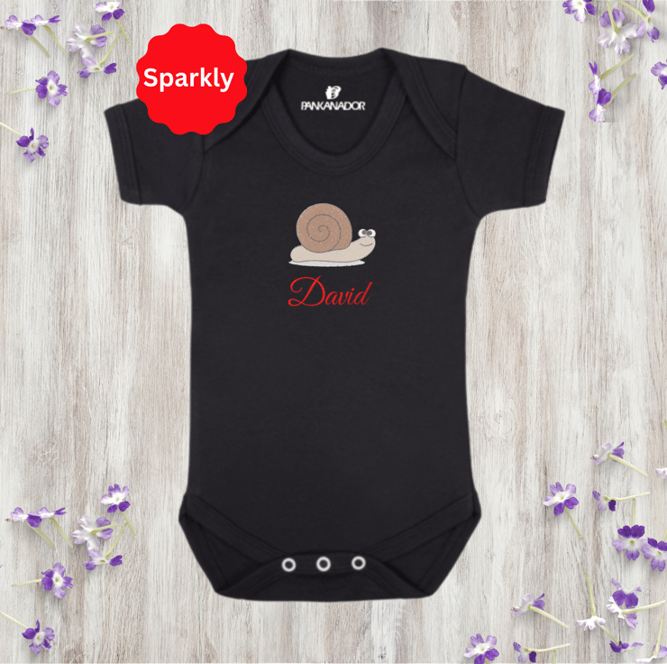 Add a little sparkle to your baby's wardrobe with this cute glitter-style snail baby bodysuit, complete with your chosen name printed underneath. This sweet and playful design makes a thoughtful gift for new arrivals, baby showers, or first birthdays.