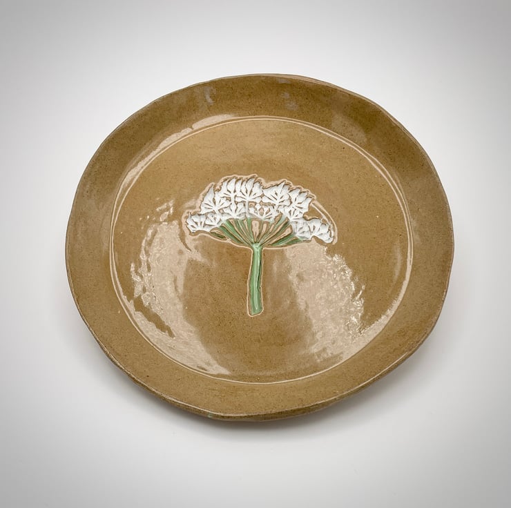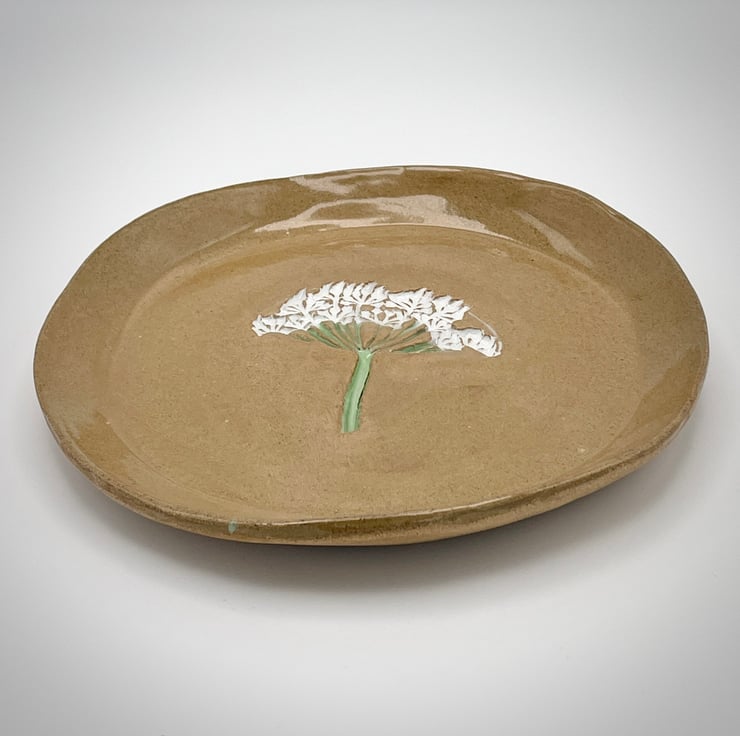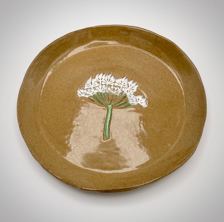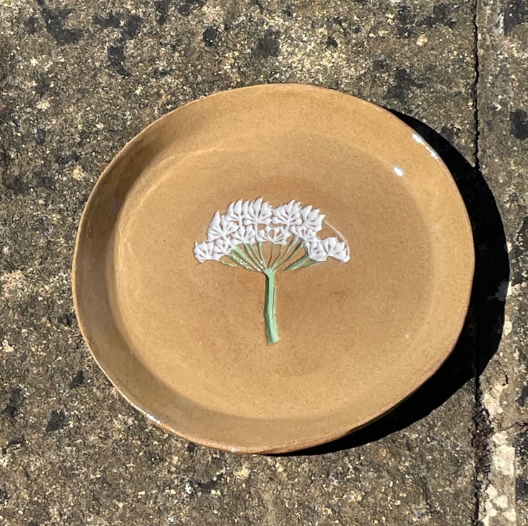 This is my handcrafted 17cm stoneware ceramic plate with a cow parsley design.