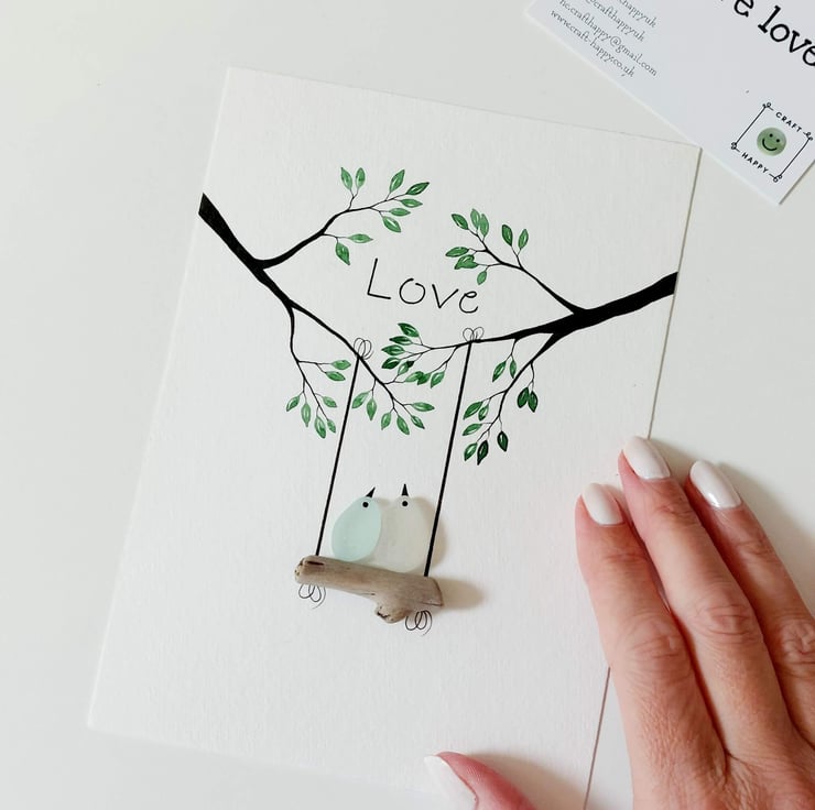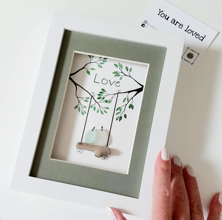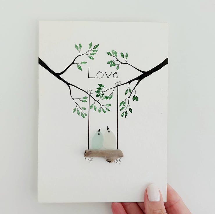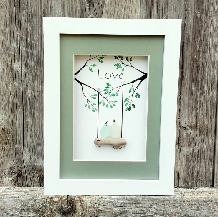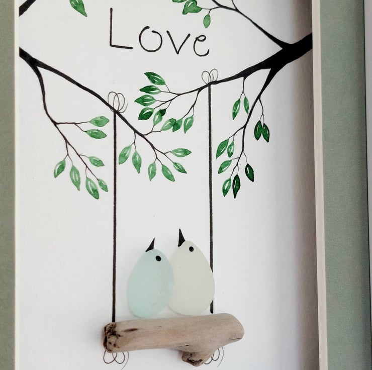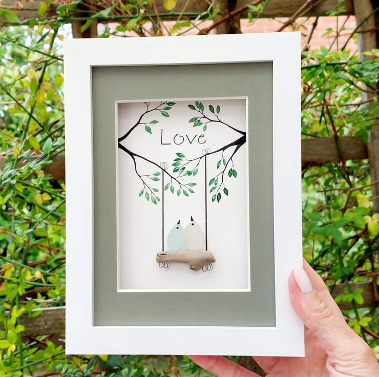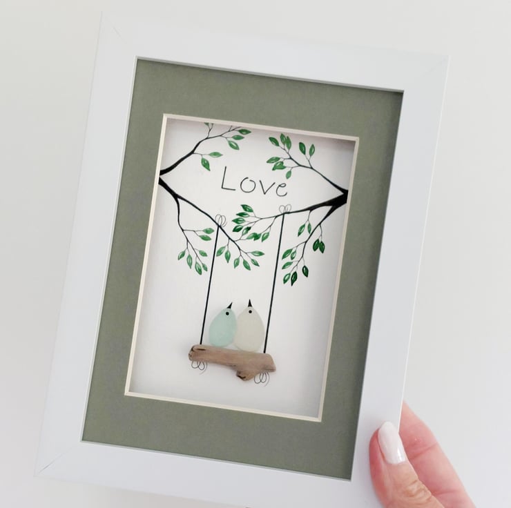 Add a touch of coastal charm to your home with this stunning Sea Glass Love Birds on a Swing Framed Picture. Ideal as an engagement or wedding gift, or for newlyweds and housewarming occasions, it’s handcrafted with care for a unique and personal feel. Made with beautifully frosted sea glass and driftwood, it features delicate hand-painted details for an extra-special finish.