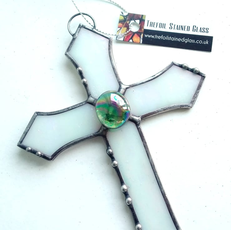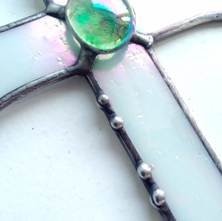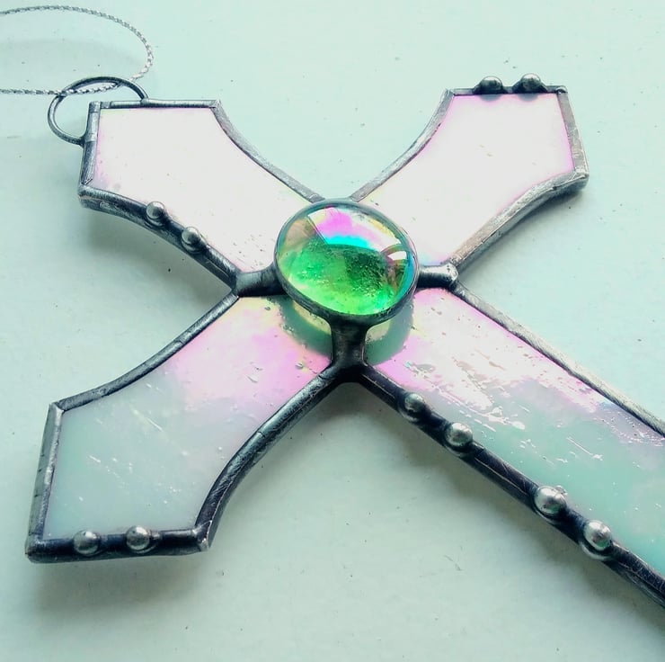 Stained glass cross handcrafted from beautiful iridised opalescent glass that flashes green/pink in the light, and finished with decorative solderwork and a glass nugget.