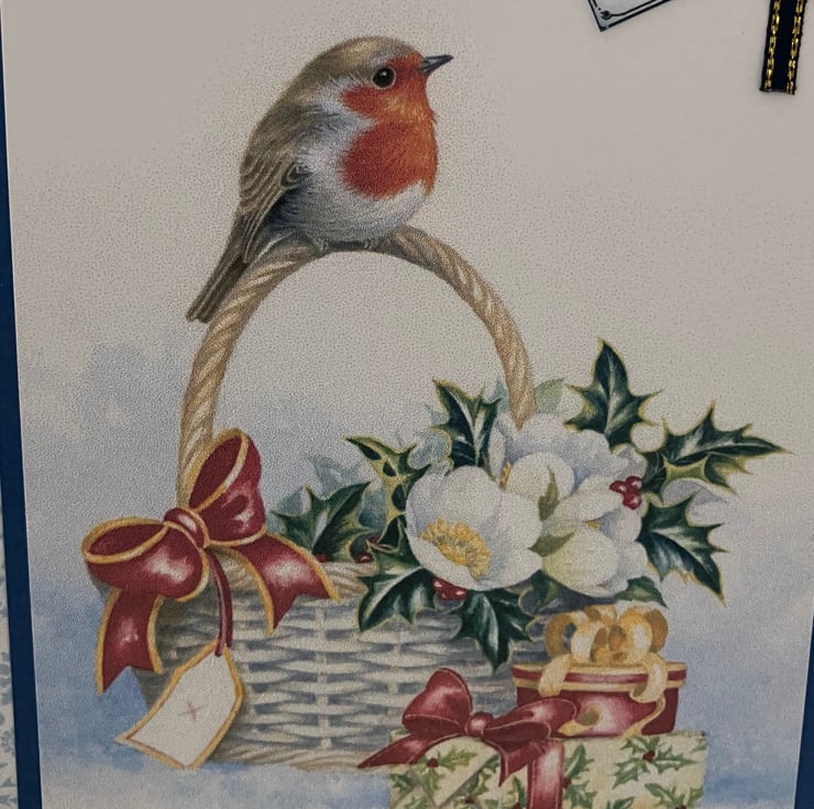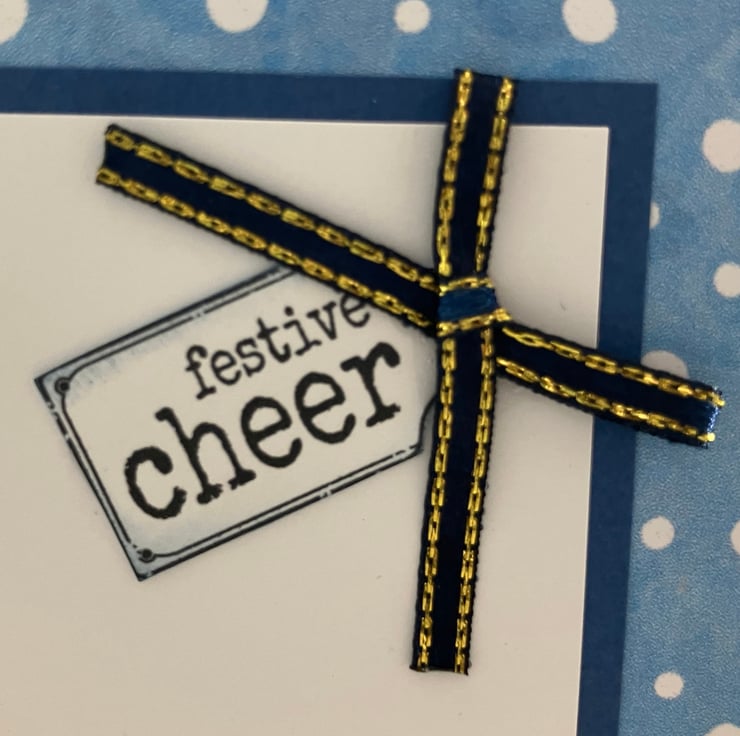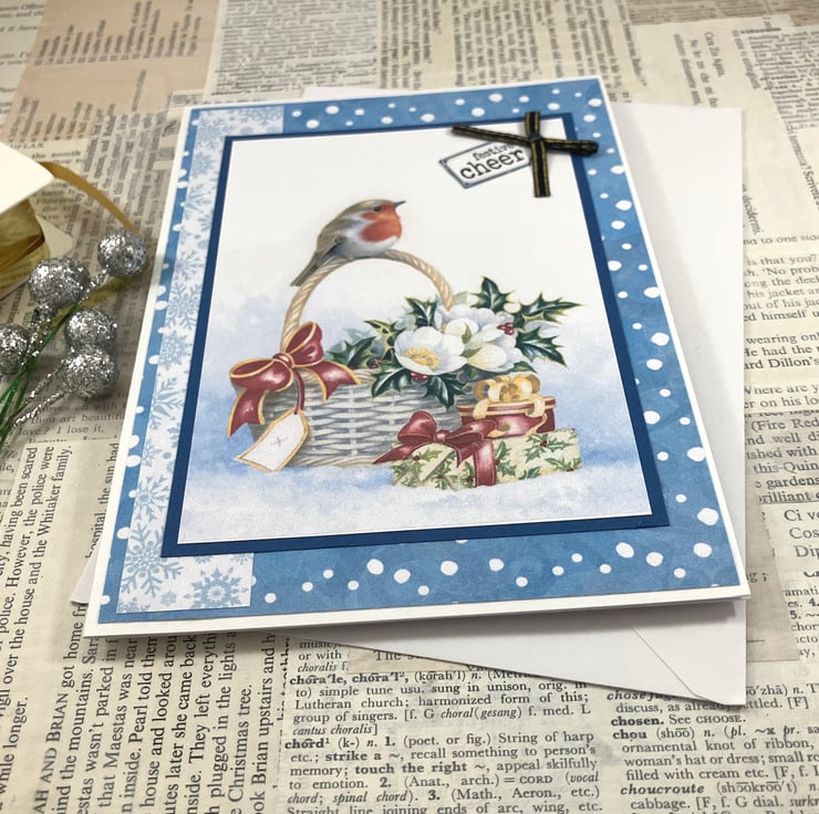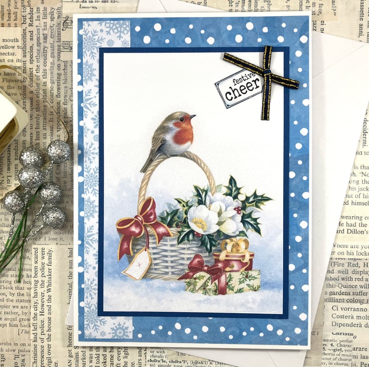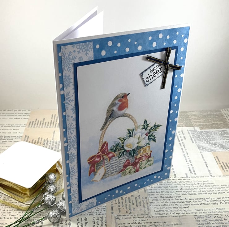 Christmas card featuring a printed image of a robin sitting on a basket of holly and christmas roses. The image has been mounted onto dark blue card and overlaid onto a background of blue and white dotted paper, with a strip of pale blue snowflake paper down one side. The sentiment is on a small tag and reads: 'Festive Cheer' and is embellished with a blue and gold satin ribbon.