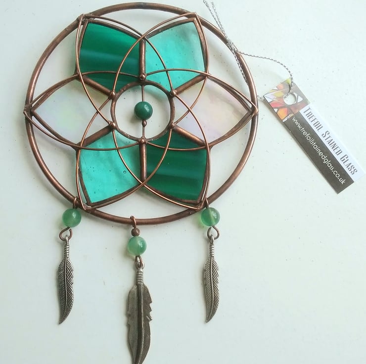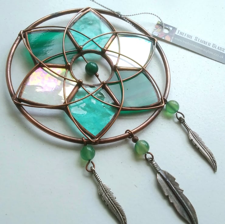 Hand-crafted from a selection of teal and iridised stained glass with copper wire and solderwork in an antique copper patina. Adorned with jade stone beads and decorative metal feathers to finish.