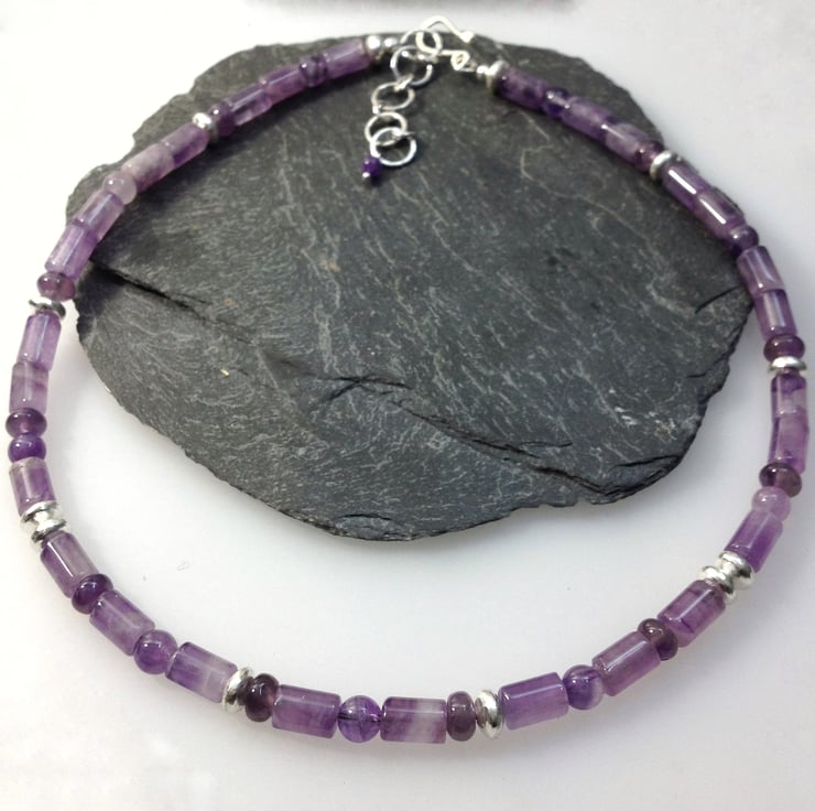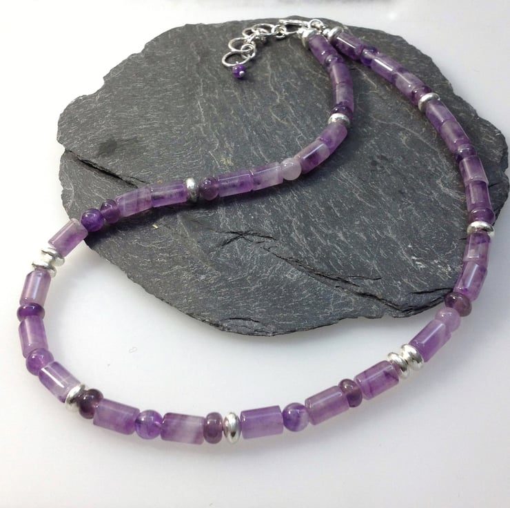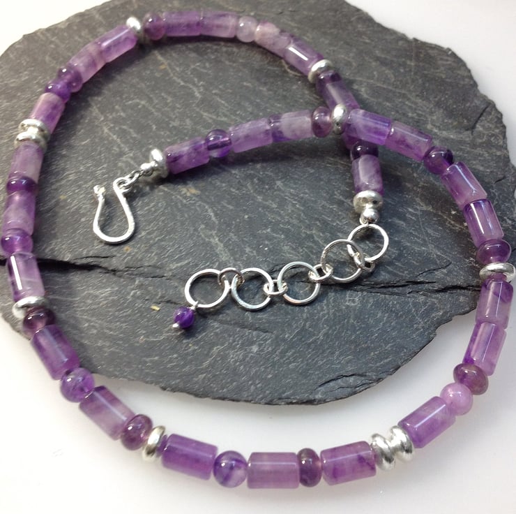 The amethyst beads are in mottled shades of dark and light purple, the silver beads have an unpolished finish which contrast nicely with the polished stone beads.