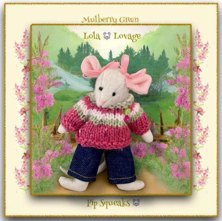 Lola Lovage, in her stripy pink jumper, jeans and pink bows, is a Pip Squeak - a young Little Nipper. Little Nippers are tiny wood mice who live in a maze of tunnels underneath the barn at Mulberry Farm. All of the Little Nippers are named after herbs and meadow flowers. Pip Squeaks are 11cm tall. Clothes made especially to fit them are also available in my shop.
