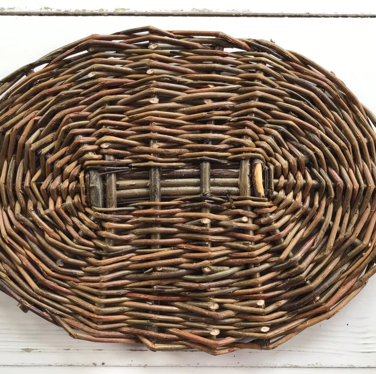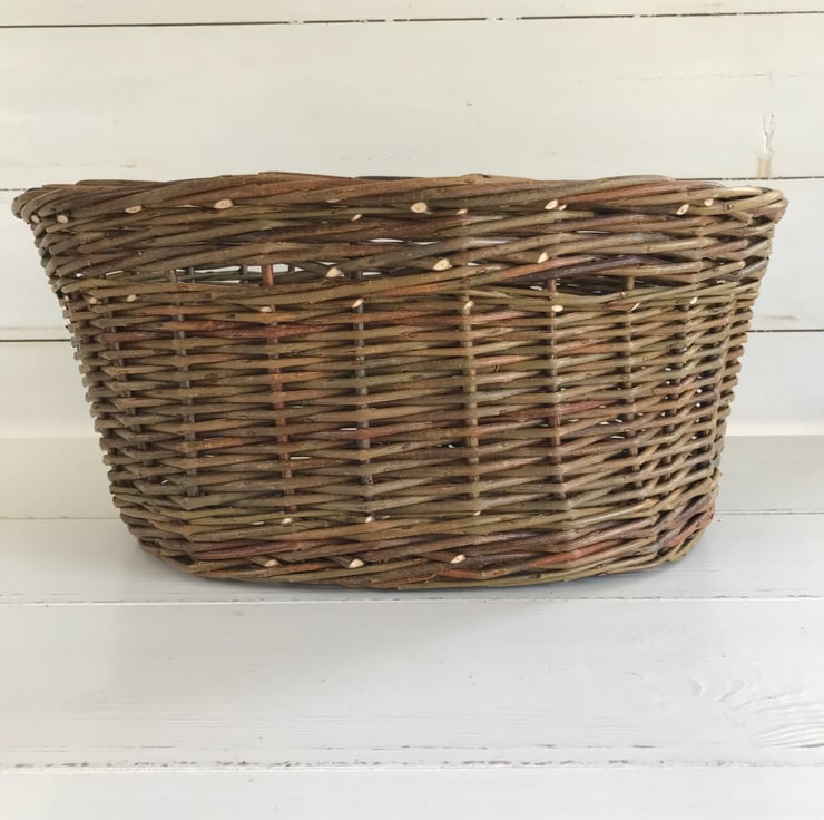 A beautiful oval willow basket hand-woven from Brittany Green willow from Somerset, perfectly finished with English leather handles hand-stitched by my friend Becs Ball from Bosorne Leatherwork.