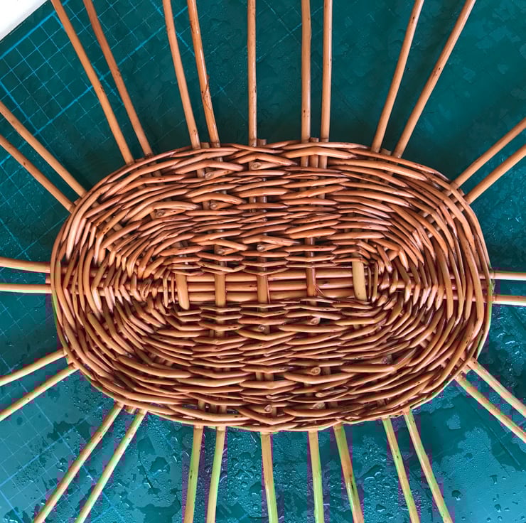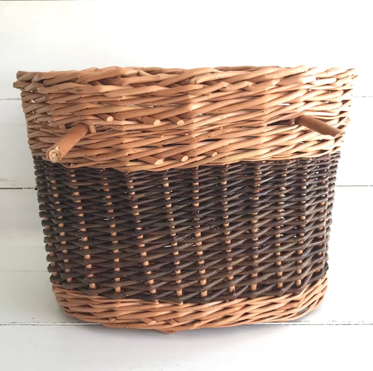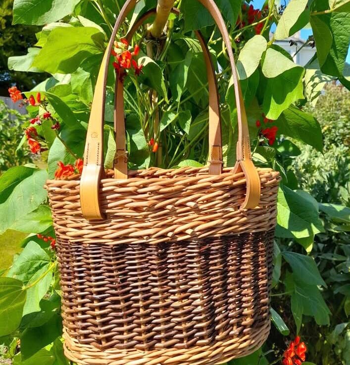A beautiful oval willow basket hand-woven from Buff and Steamed Black Maul willows from Somerset, perfectly finished with English leather handles hand-stitched by my friend Becs Ball from Bosorne Leatherwork.