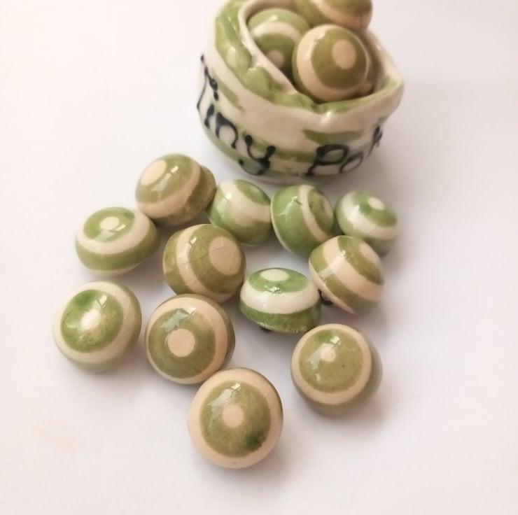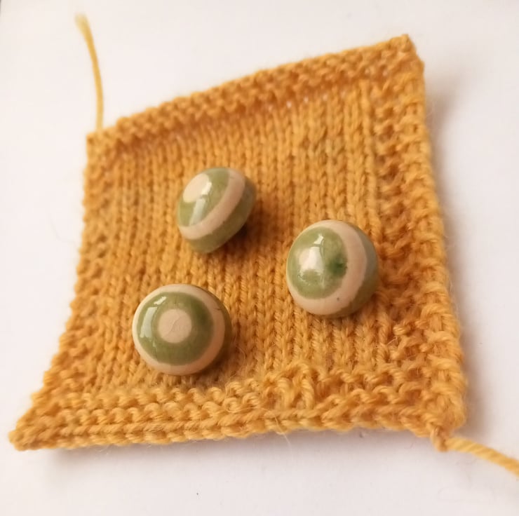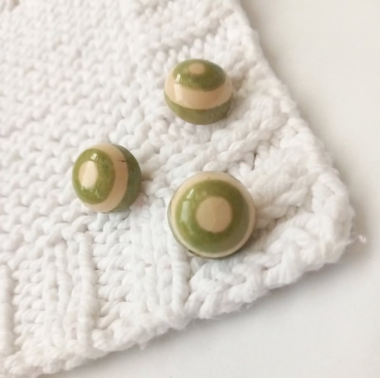 A set of 5 handmade green and cream earthenware ceramic buttons in a dome shape finished in a transparent crackle glaze. Perfect to finish of a special garment or yarncraft project.