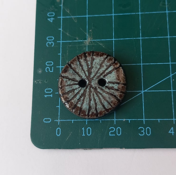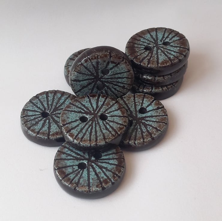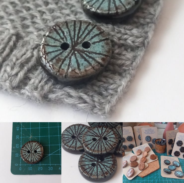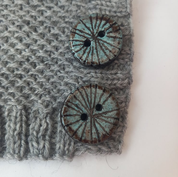These buttons are made with a black clay base and blue slip on top, then I scratch through the slip to make the mill wheel design. Handmade earthenware blue and black ceramic buttons with 2 holes. Inspired by mill stones, these buttons are chunky! Pictured here on a 4 ply grey marl yarn.