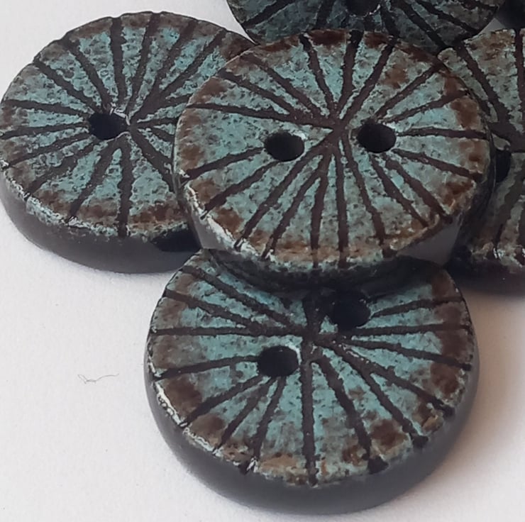 These buttons are made with a black clay base and blue slip on top, then I scratch through the slip to make the mill wheel design.