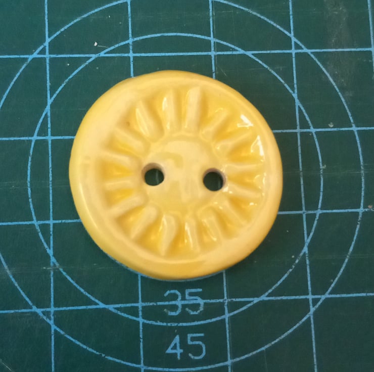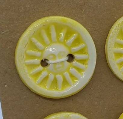 A jolly sunshine yellow button embossed with a sun design, perfect for brightening up a dull day. Handmade ceramic buttons embossed with a sunshine design and handpainted, glazed and fired by me at home.