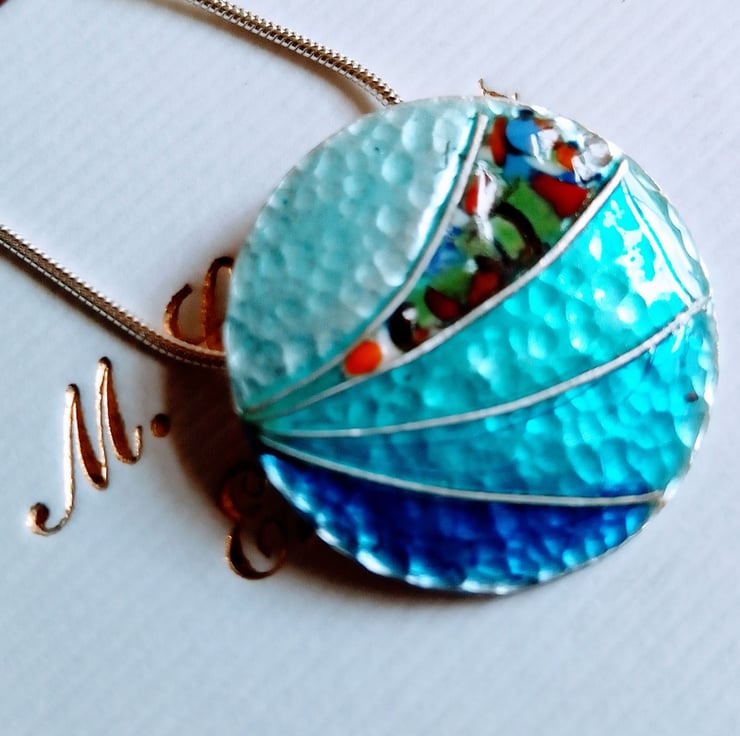 This beautiful round necklace is made from fine silver (99%), hammered, then kiln-fired transparent enamels and crystals added, depicting the sea and shoreline. It measures 25mm in diameter. I have added a very fine 18" snake chain to complete the look.