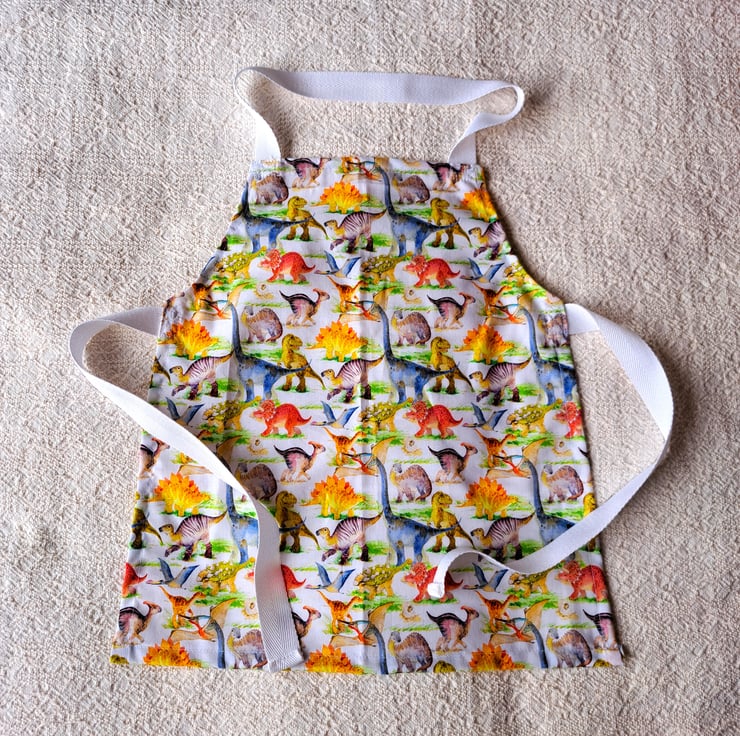 Dinosaurs in bright colours romp all over this gorgeous white cotton apron, which is equally suitable for a little boy or girl. It measures 16.5" (42 cm.) approximately from neck to hem, and 14.5" (37 cm.) at the widest point, and should fit a child of between two and six years old. The straps are acrylic herringbone. Being good quality cotton the apron can be machine washed and ironed.