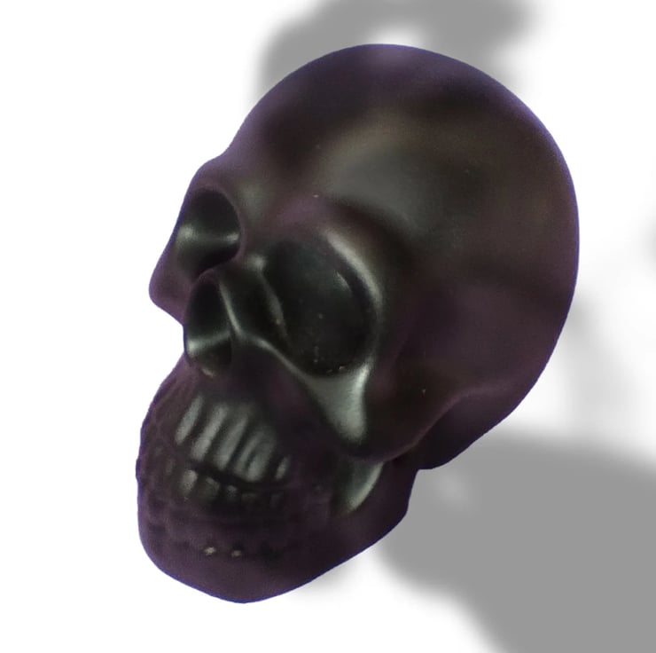 This is a Jesmonite eco-resin skull that has been spray painted black.