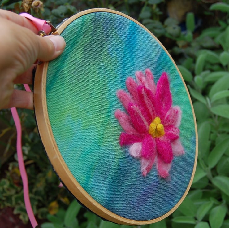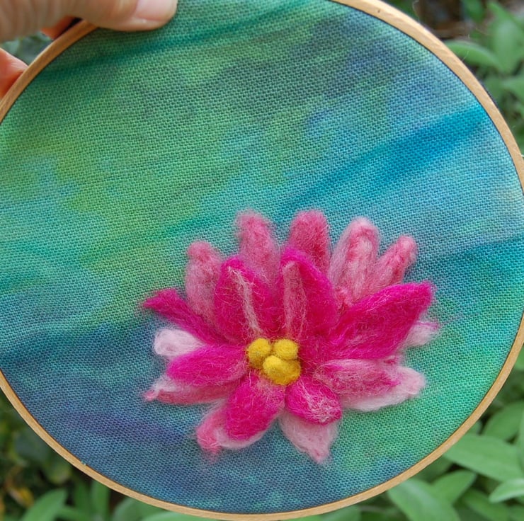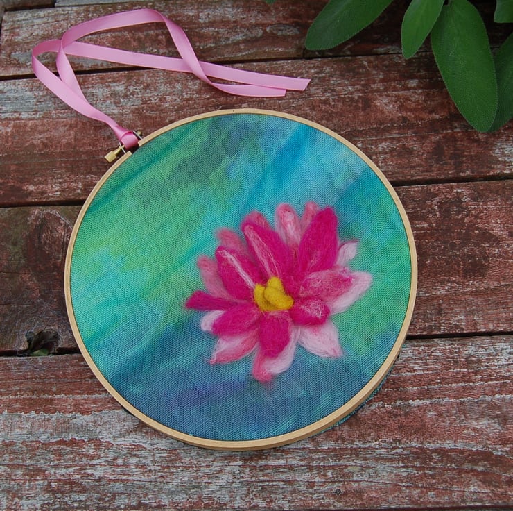 A waterlily wool picture in an embroidery hoop frame. The beautiful hand dyed linen fabric is perfect to show off this stunning pink waterlily.