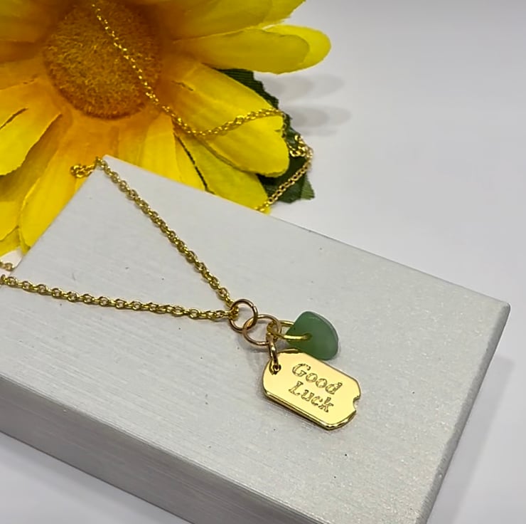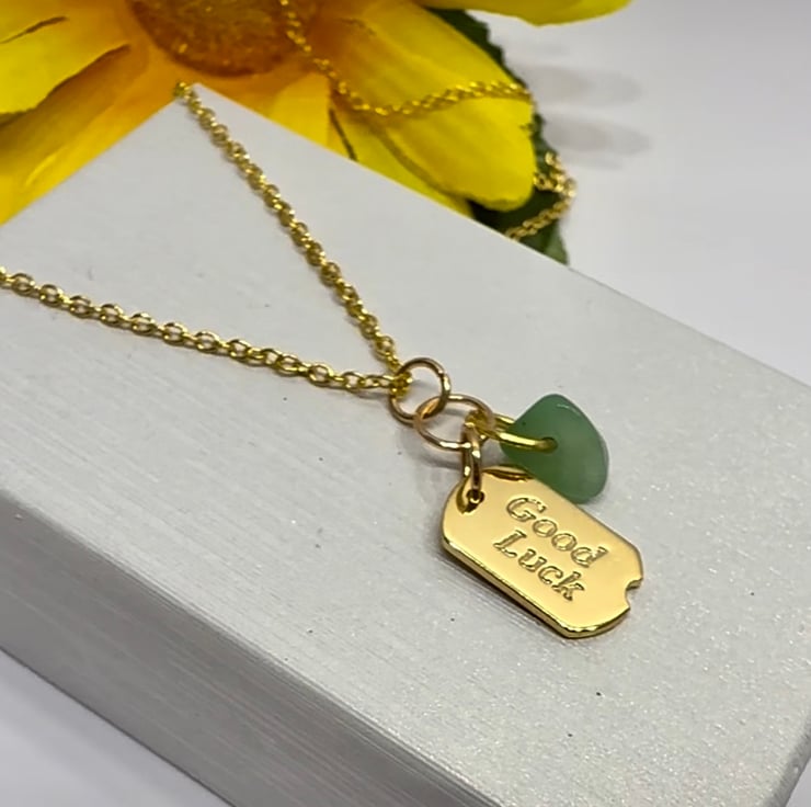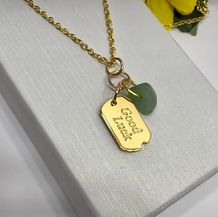 The good luck charm is 18k Gold plated and is teamed with a piece of Aventurine, often referred to as the Stone of Opportunity, believed to attract Luck and Prosperity. The charms hang on a Gold plated link chain. A lovely piece to add to your Jewellery collection or why not gift it to someone that would like a bit of luck