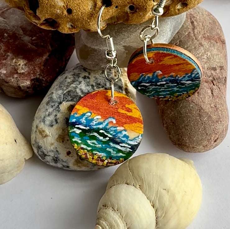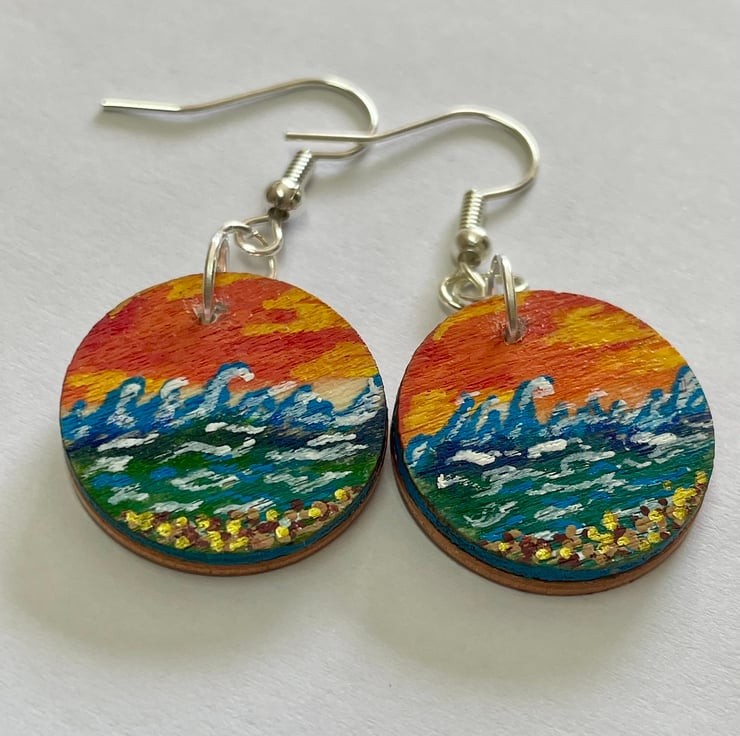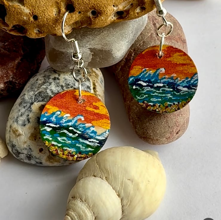 Small hand painted earrings with sunset, ocean and beach design. Painted with Acrylic paints with a protective finish. The back of the earrings are also decorated.... I've hand engraved a copper ring with a random pattern and given a water effect by using resin and felt circle for the sun. If you look closely you can see a slight shimmer on the sand. Ideal if you're a lover of the ocean and beautiful sunsets. Hung on Sterling Silver hooks.