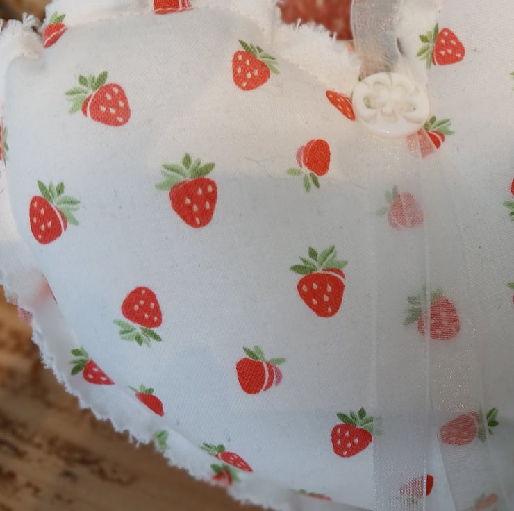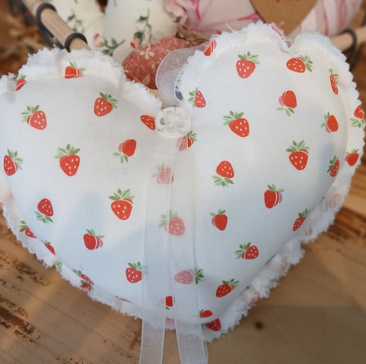 Each heart is made unique, from a selection of beautiful fabrics, decorated with a beautiful co-ordinating bow and button. The widest part of the heart measures approximately 17cm and are approximately 17cm in length.