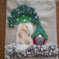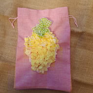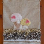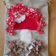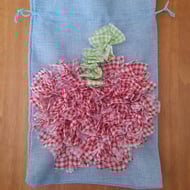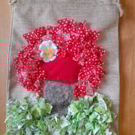 A beautifully handcrafted drawstring bag (20x30 cm) made from hessian-style fabric, featuring a vibrant rag rug heart design. Perfect for gifting, storage, or simply adding a touch of playful cottage charm to your everyday. Handmade with care and bursting with texture and colour.