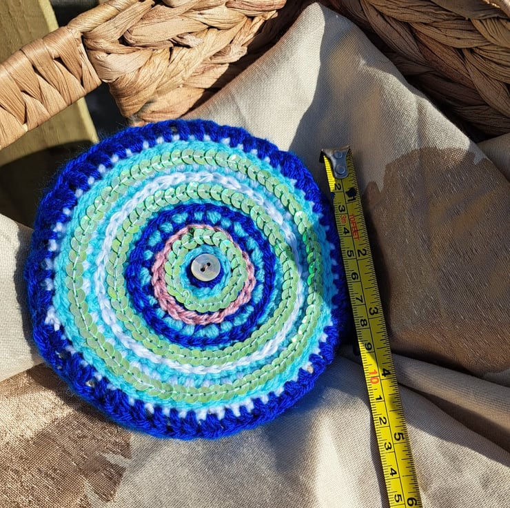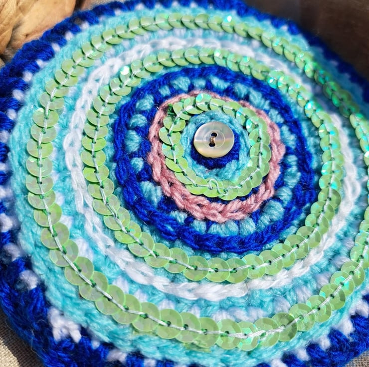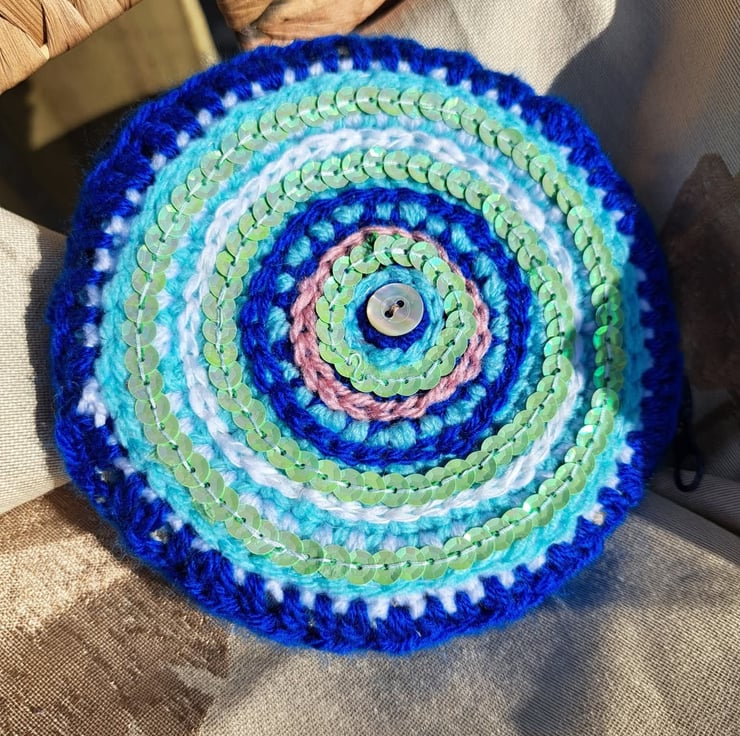 Inspired by the ocean and living by the sea. Crochet purse with embroidery and sequins. Vintage button in the middle. Perfect for a beach lover. Zip closure. Keep away from velcro and keep dry