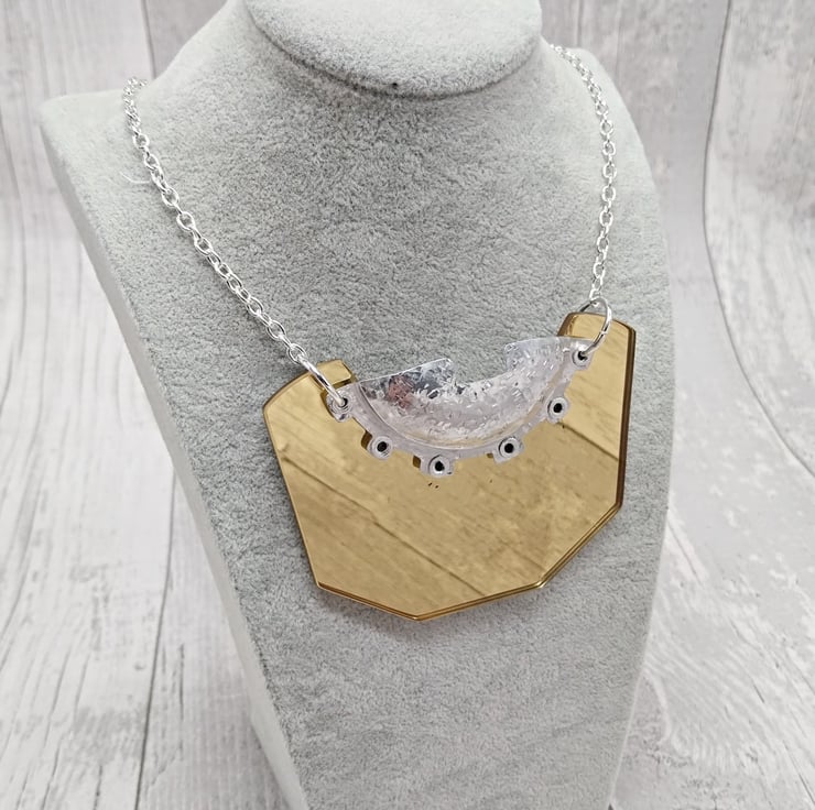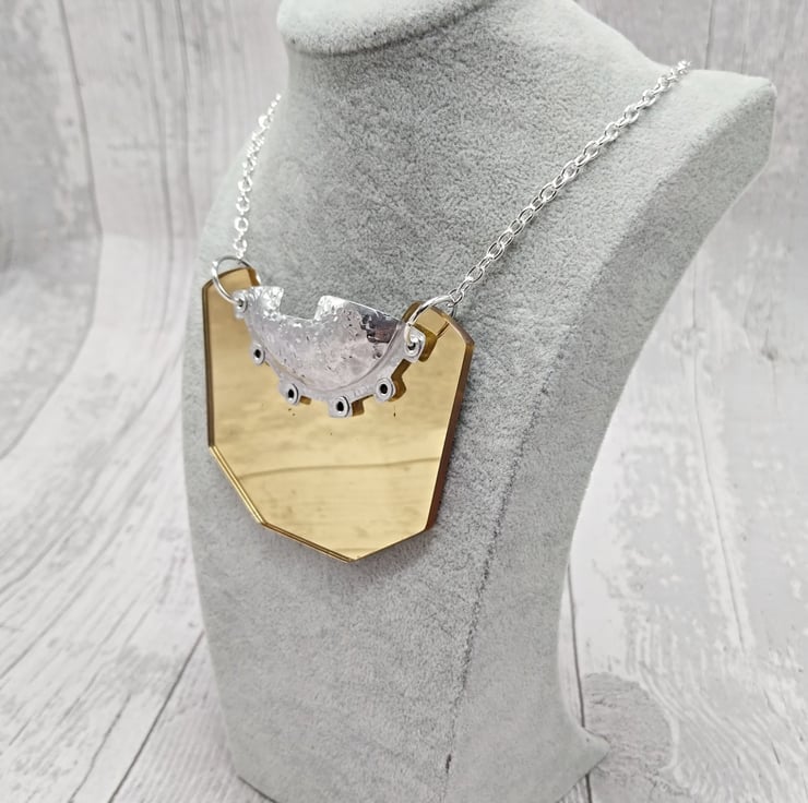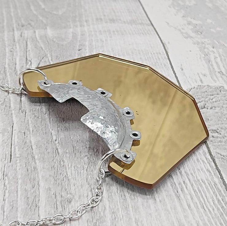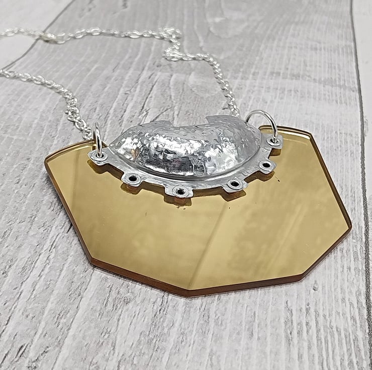 Handmade necklace made from recycled aluminium drink can complemented with the addition of an acrylic shape. The design focuses on the metal base of the can incorporating the domed shape which I have cut, shaped and hammered texture too giving this necklace it’s unique and one-of-a-kind individuality. The acrylic shape cut by hand also with a bold shape and bright mirrored gold colour, this is riveted to the metal using aluminium tubing. Eco-friendly material and lightweight and comfortable to wear for all occasions.