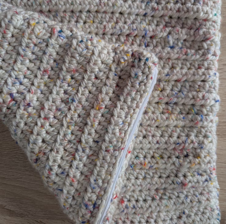 A cream removable cushion cover with zip fastening and pops of colour, made using a simple repetitive crochet stitch to allow this chunky, squishy yarn to shine in all its glory.