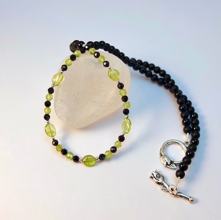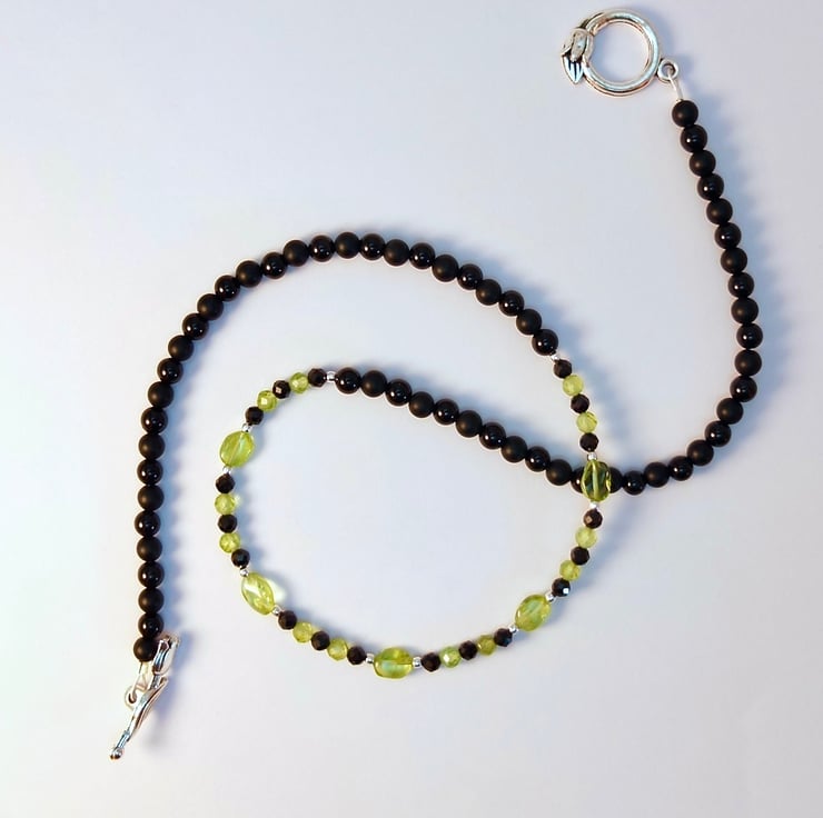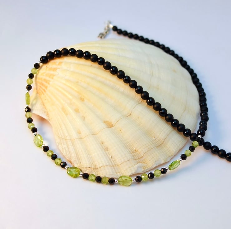 This dainty necklace features a centrepiece of five 6x5mm oval Peridot beads between rows of five alternating 3mm faceted AAA grade beads of Black Spinel and Peridot, highlighted with tiny 1.8mm sterling silver spacers.
