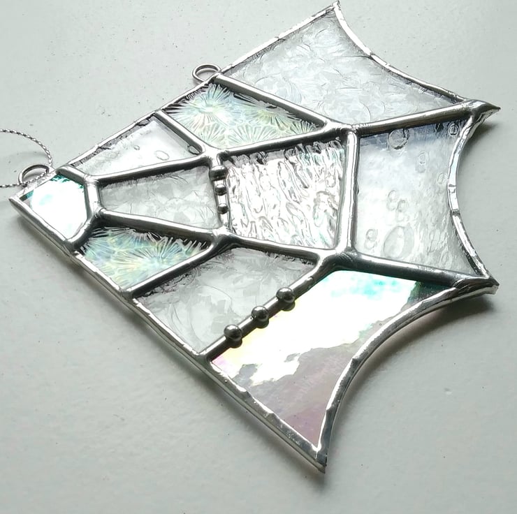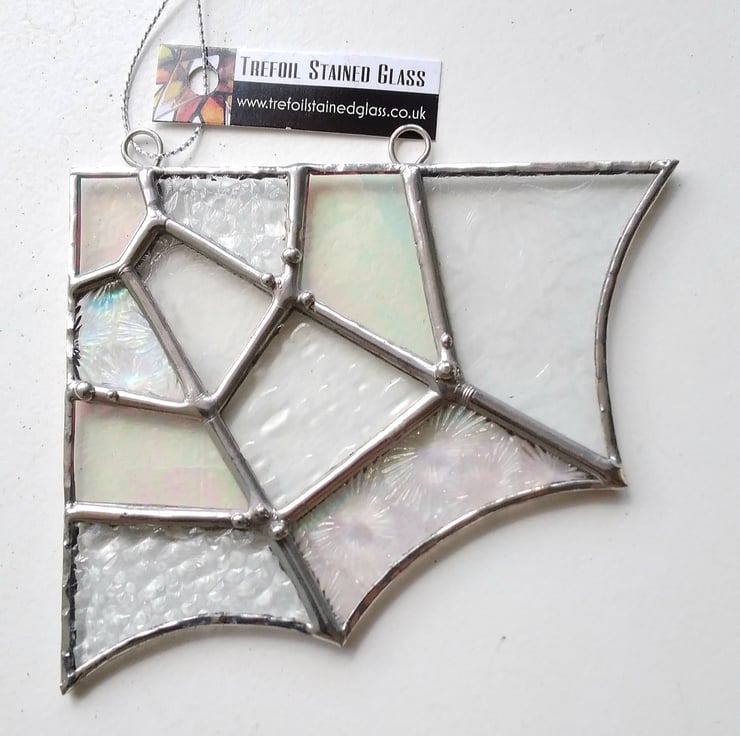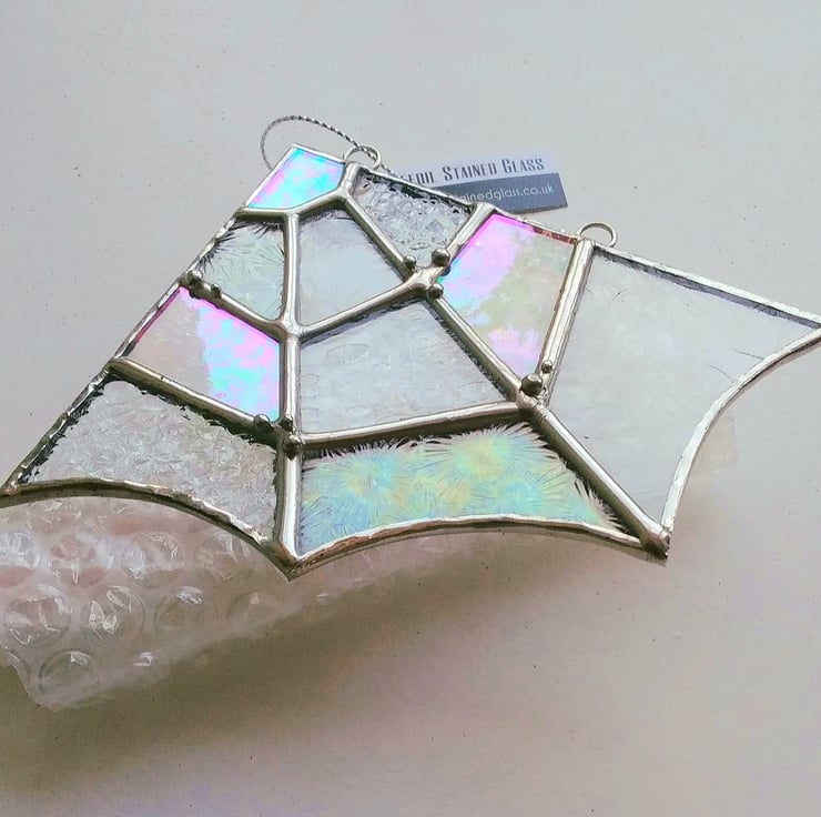 Stained glass spiderweb handcrafted from a spooky selection of wispy, textured and iridised glass types and finished with polished silver solderwork details. Ideal to add a spooky, sparkly feature to a doorway or shelf (spiders available to purchase separately).