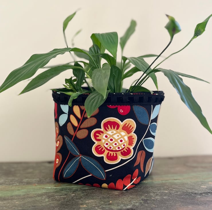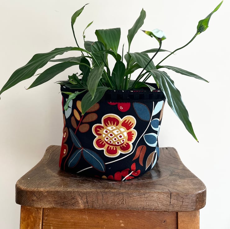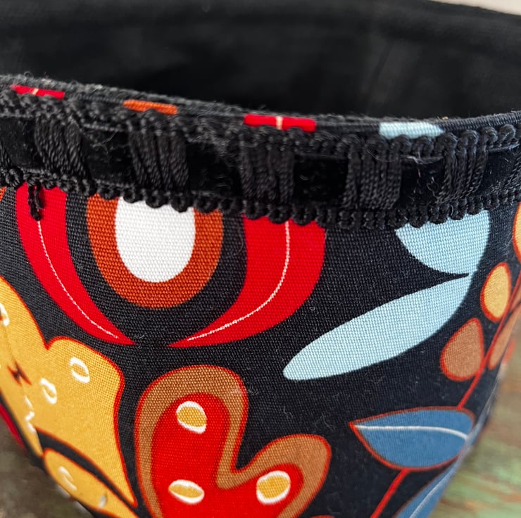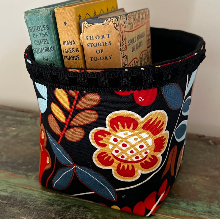 Colourful storage basket made from bright ikea cotton fabric with a leafy, scandi print on a black background and black linen blend fabric. A layer of interfacing between the layers makes it sturdy. The top edge is trimmed with a velvety black braid.