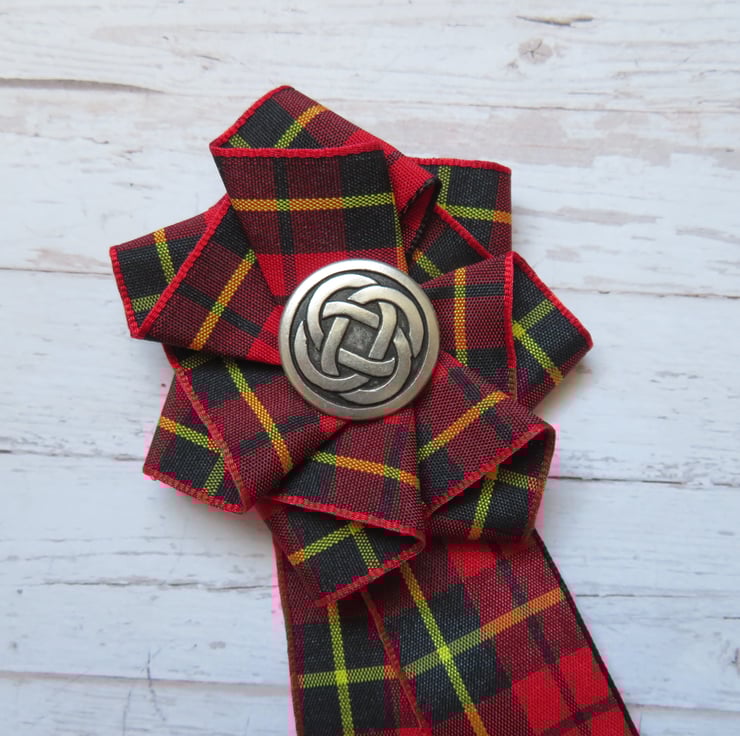 Created with a handmade and sewn ruffle of rare Wallace Red Modern tartan ribbon, this ribbon is a little narrower so the ruffles are not as big as the other tartans I have, with wide ribbon shaped trails.