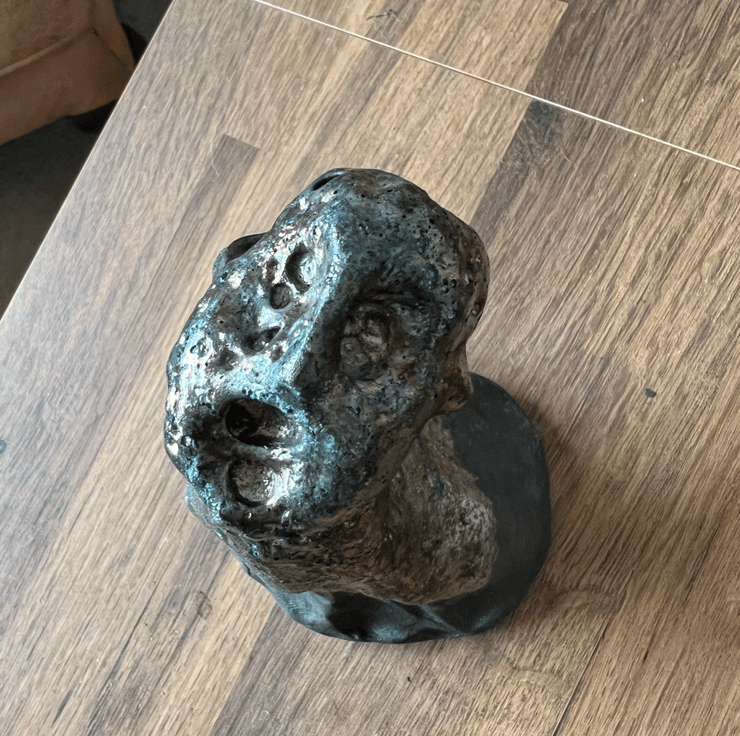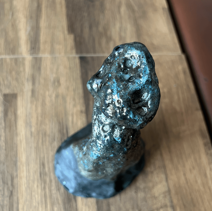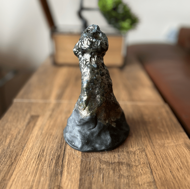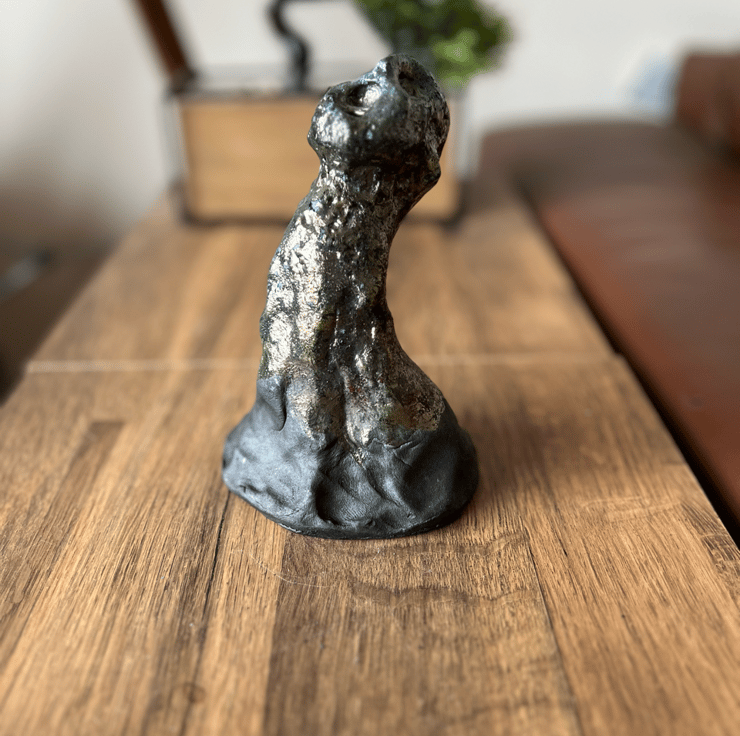 This is the first piece in a series of sculptures focusing on the visual manifestation of mental health symptoms. my aim is create works that people can relate to and connect with emotionally. I used Ahraf Hana clay and glazed with a copper oxide Raku recipe. The base has been left unglazed and has burnt black. This glaze is porous and not food safe.