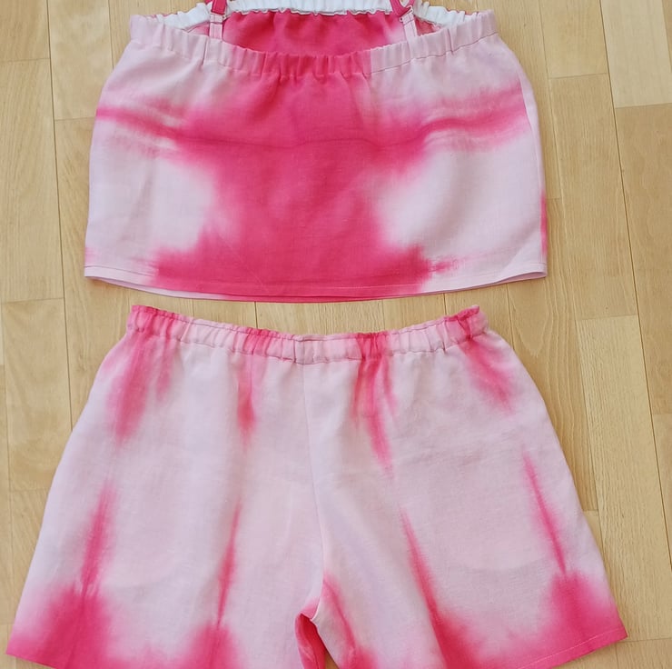 This play suit comprises of a pair of elasticated waist shorts with pockets and a draw string and an elasticated top camisole with adjustable straps, to add to the overall look of the tie dye, I have also used a variegated thread throughout.