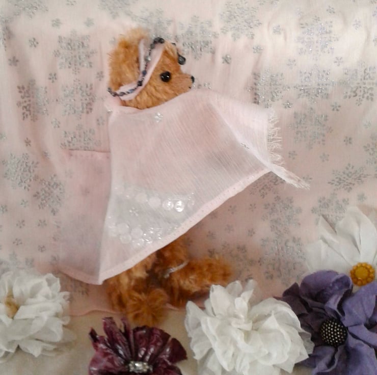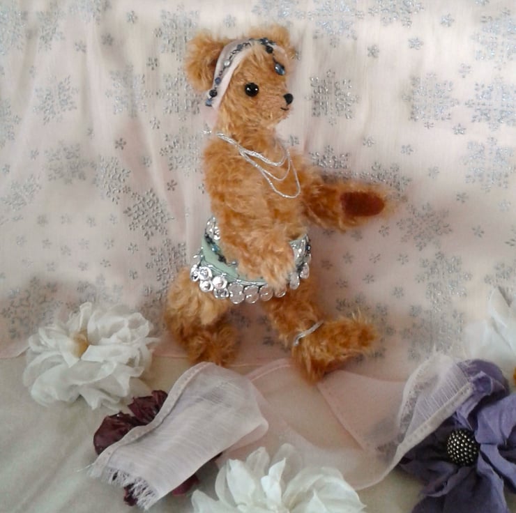 Jasmine is a 10 inch tall collectable bear made from beautiful quality Schulte Mohair fabric. She is traditionally jointed as you can see from her beautiful dancing and is quite a slender bear apart from a little pot belly necessary for her style of dance. I love the idea of bears dancing because they want to rather than being cruelly made to and I now have several dancing bears in my shop.