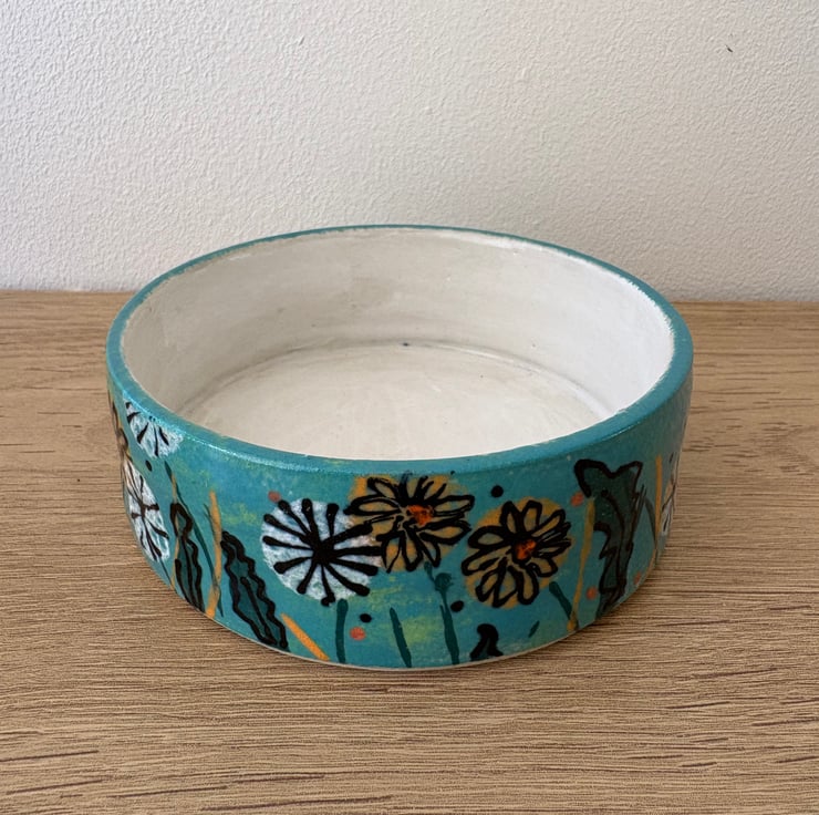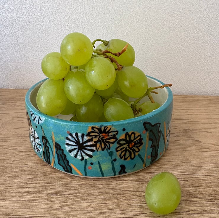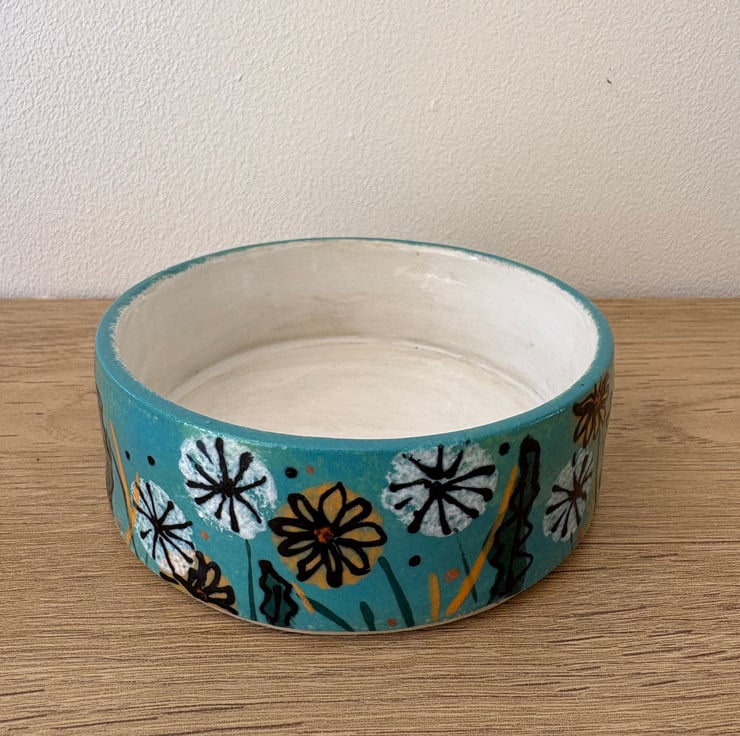 This straight-sided ceramic stoneware dish is decorated with a wildflower design. After biscuit firing I paint the vessel by hand with underglazes before covering with a clear stoneware glaze and giving it a final stoneware firing. The dish measures 105mm in diameter and is 40mm deep.