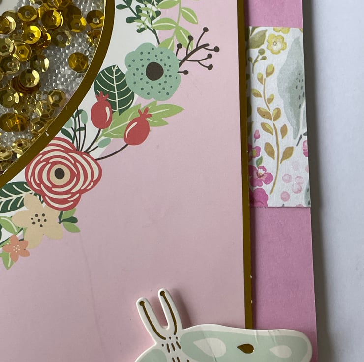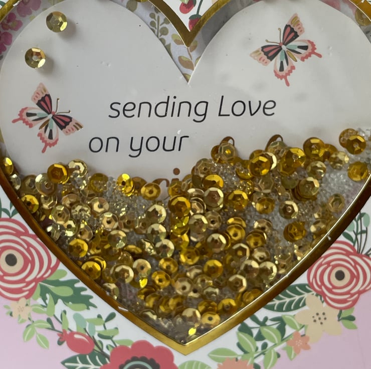 A lovely feminine card to celebrate a birthday. This 17.5x17.5cm card has an interactive shaker design. The background is a lovely pink which has hearts stamped around the edge in a tone on tone colour. This is topped with a gold edged topper with a heart aperture. This is surrounded with a flower and leaves design. The heart has a backing greeting which says Sending love on your special day, this has gold sequins and clear beads on top in a shaker design. You can only see the greeting when you shake the card and each bit is revealed. A butterfly finishes the design. Inside the card has the greeting Throw happiness around like confetti and has tiny hearts stamped around the edge. A very pretty and different design to send to a loved one.