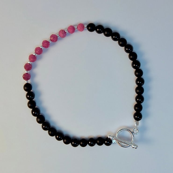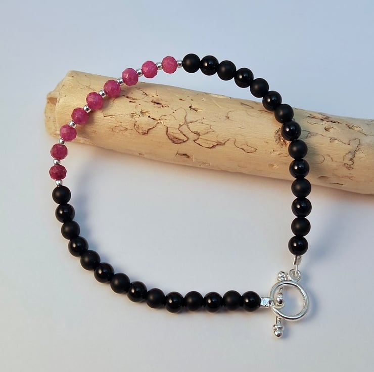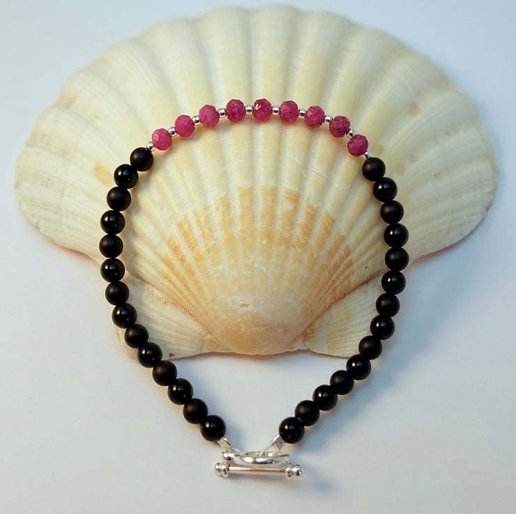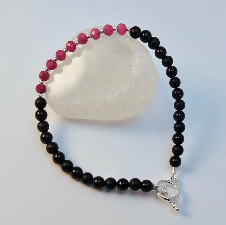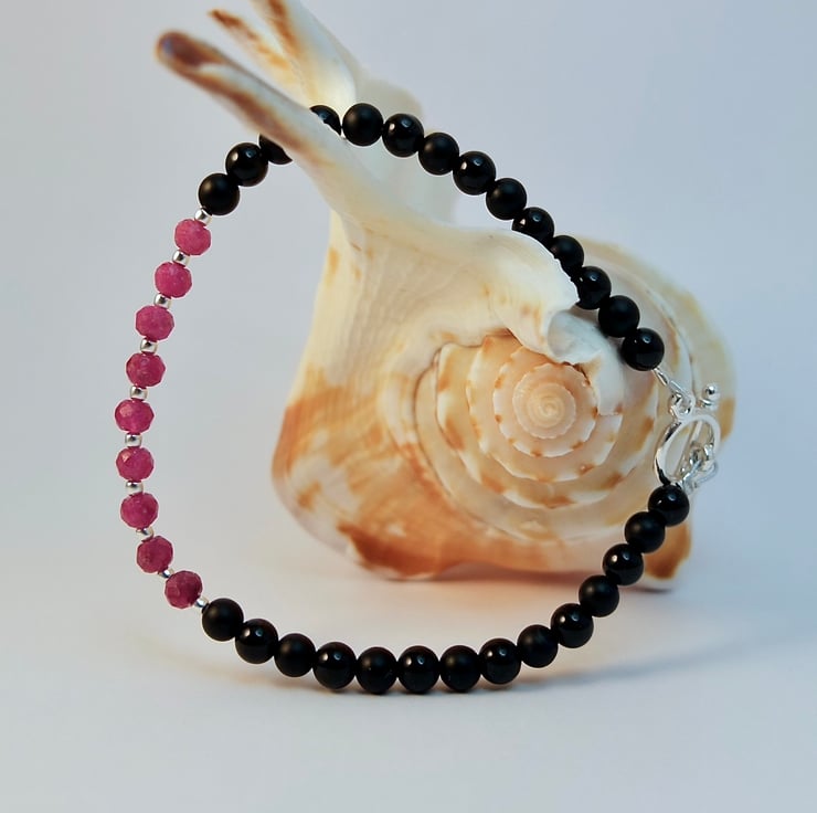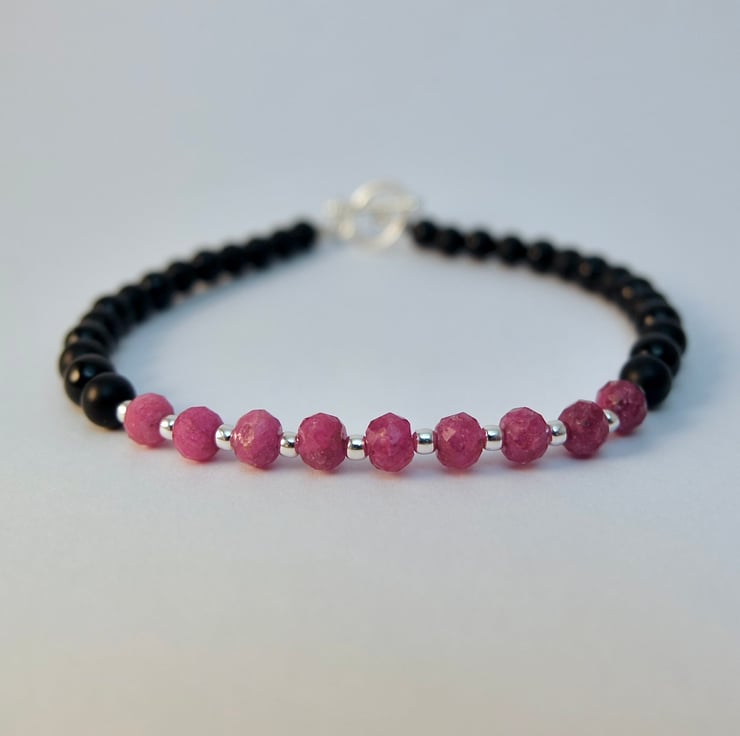 Dainty bracelet with a centrepiece of nine 4mm faceted Ruby rondelles, separated by 1.8mm sterling silver spacers and set between a mix of frosted and smooth 4mm black Onyx beads which really set off the dark raspberry pink of the Rubies.