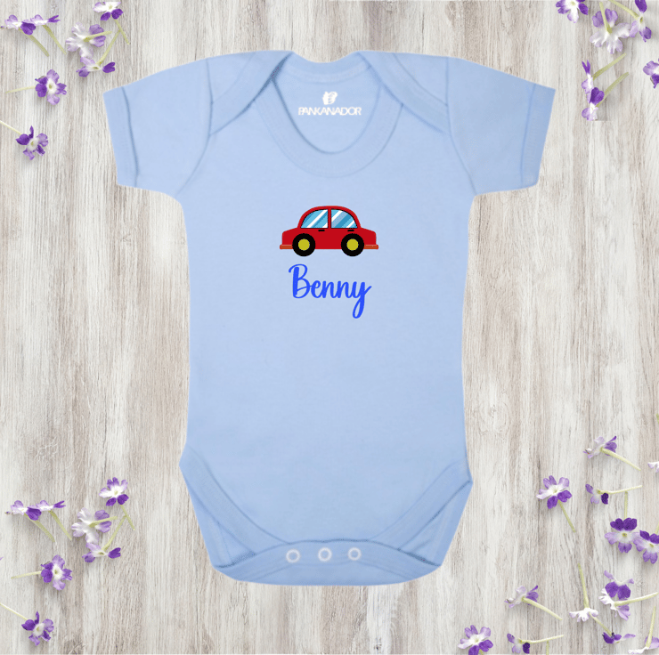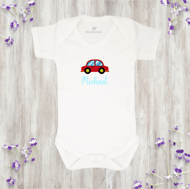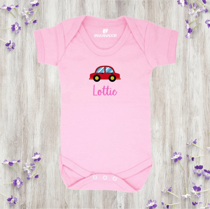 Cars are one of the first things many babies recognise and get excited about – their colours, sounds and movement spark curiosity early on. This design celebrates that fascination with a friendly car and a name to make it theirs.
