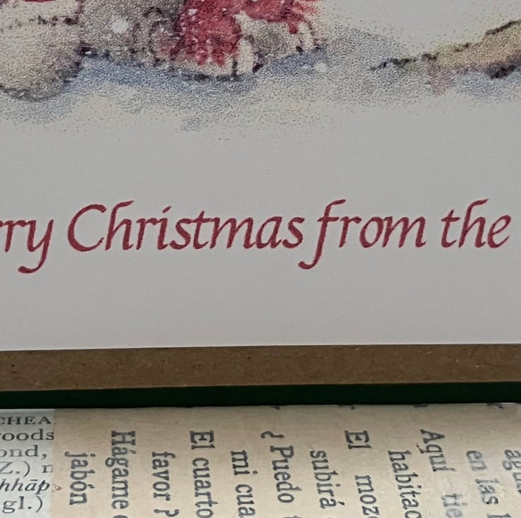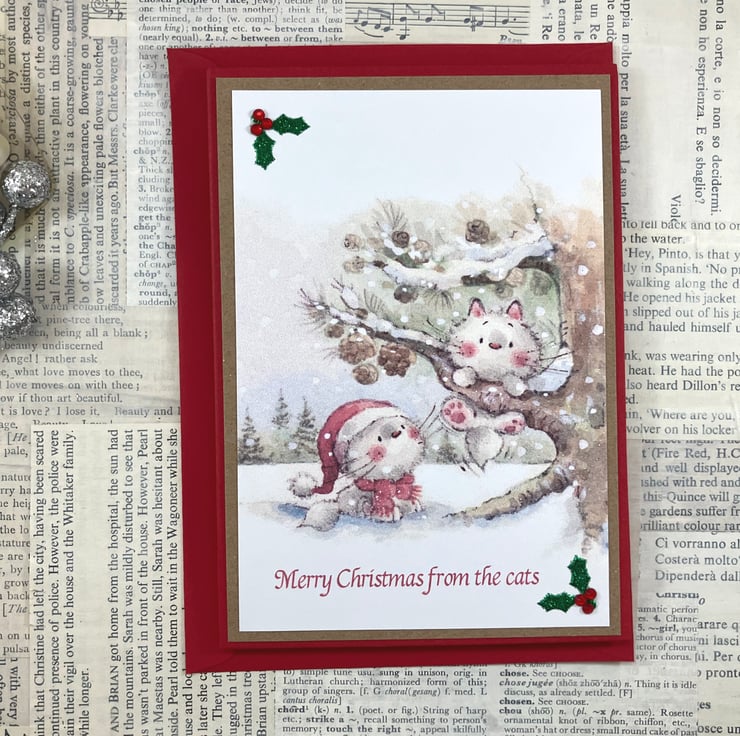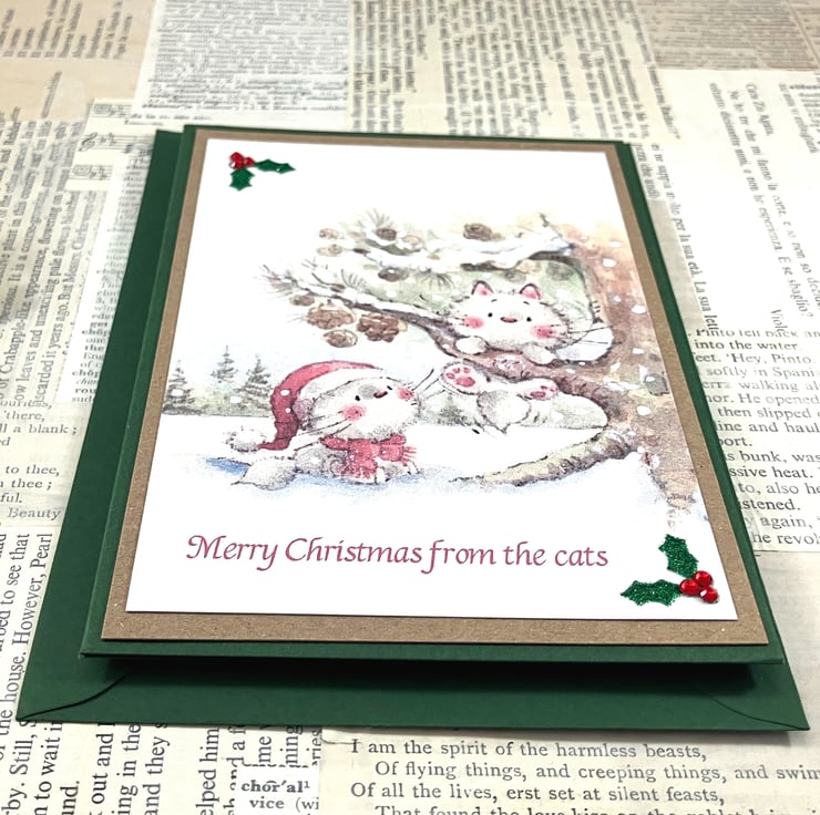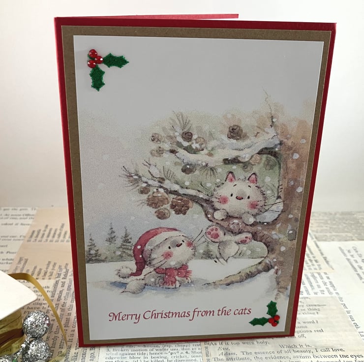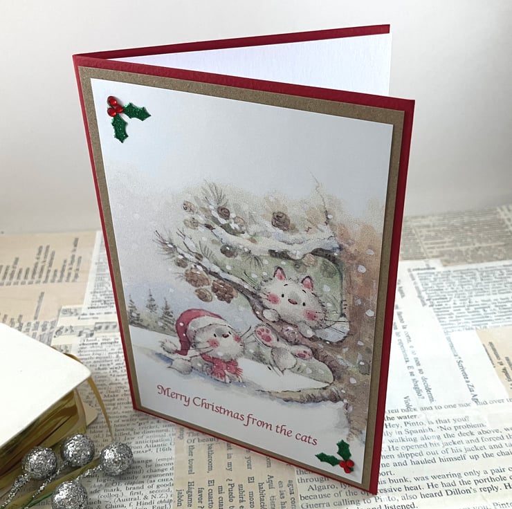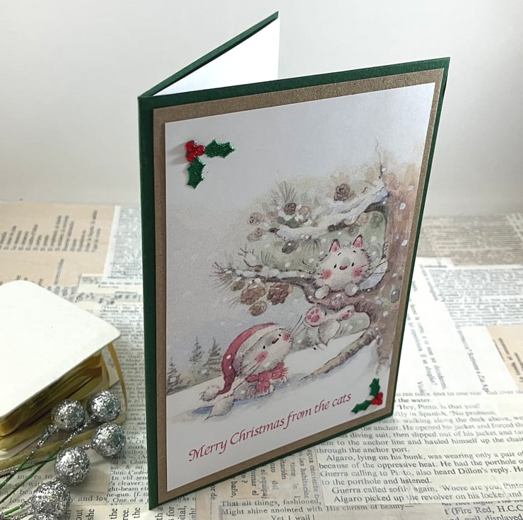 A6 Christmas card, available in green or red, featuring a printed image of two cats playing in the snow at the base of a tree. The sentiment 'Merry Christmas from the cats' has been printed below the image and glittered holly embellishments added in two corners. The image is mounted on kraft card on a coloured card base.