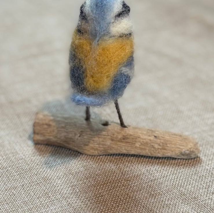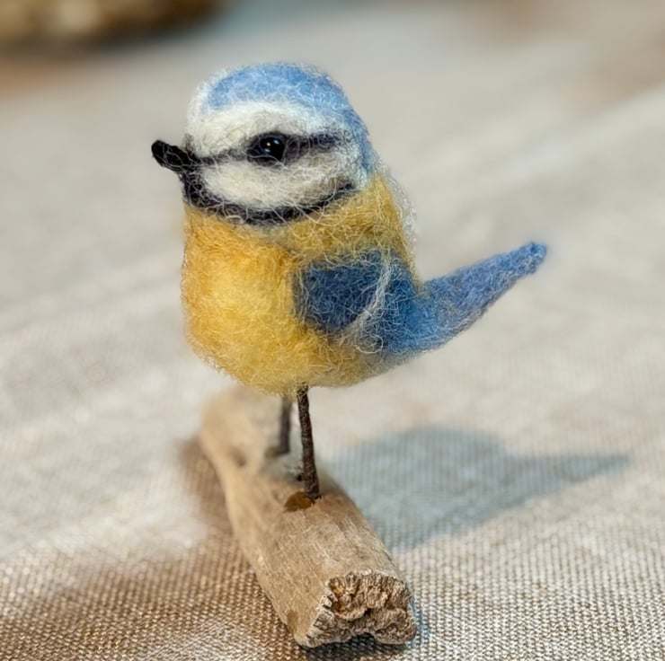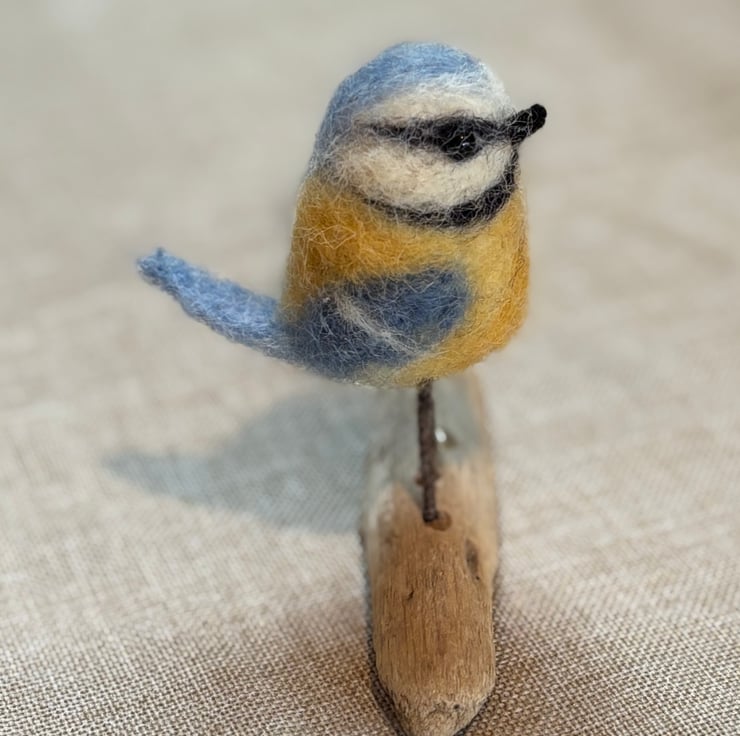 A small rotound blue tit. Made with wool, hand felted. No pattern so each one unique. Fab for any bird lover in your life as a gift, collectible. Stands 6 cm tall on driftwood