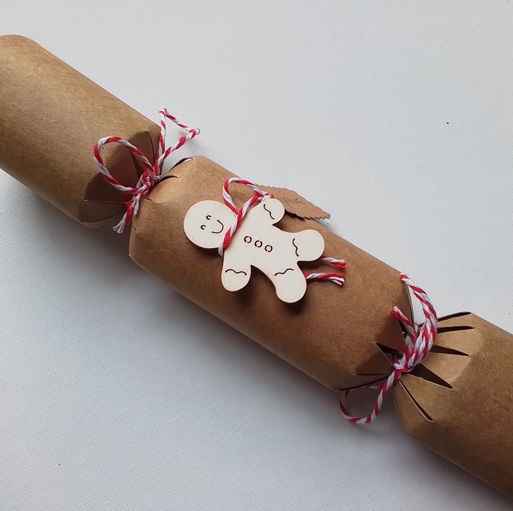 The set comprises of 6 cut out crackers, 6 wooden gingerbread men, snaps, hats, jokes and twine.
