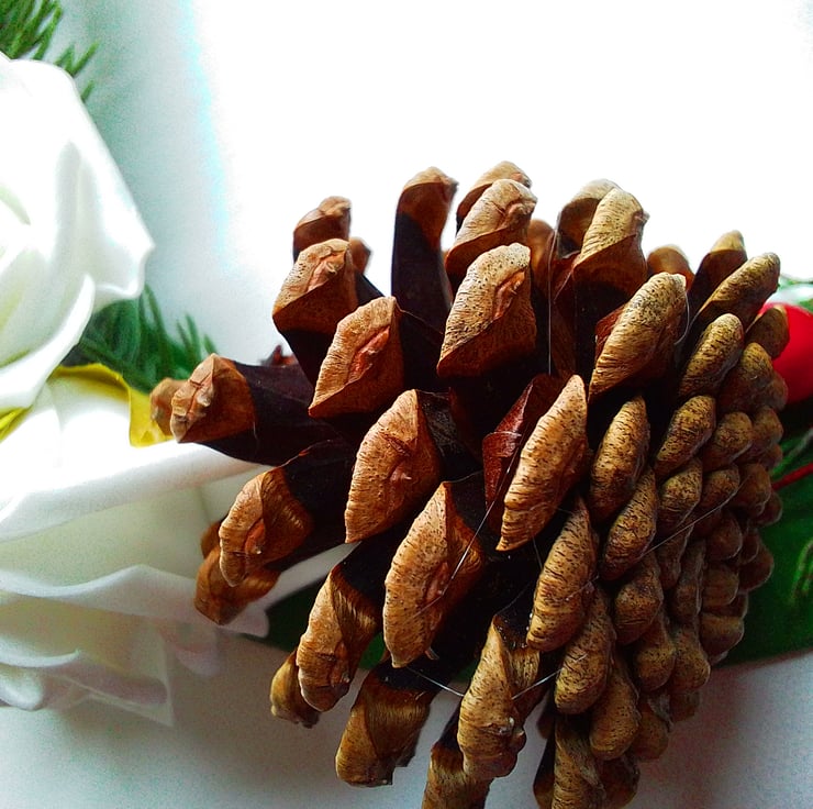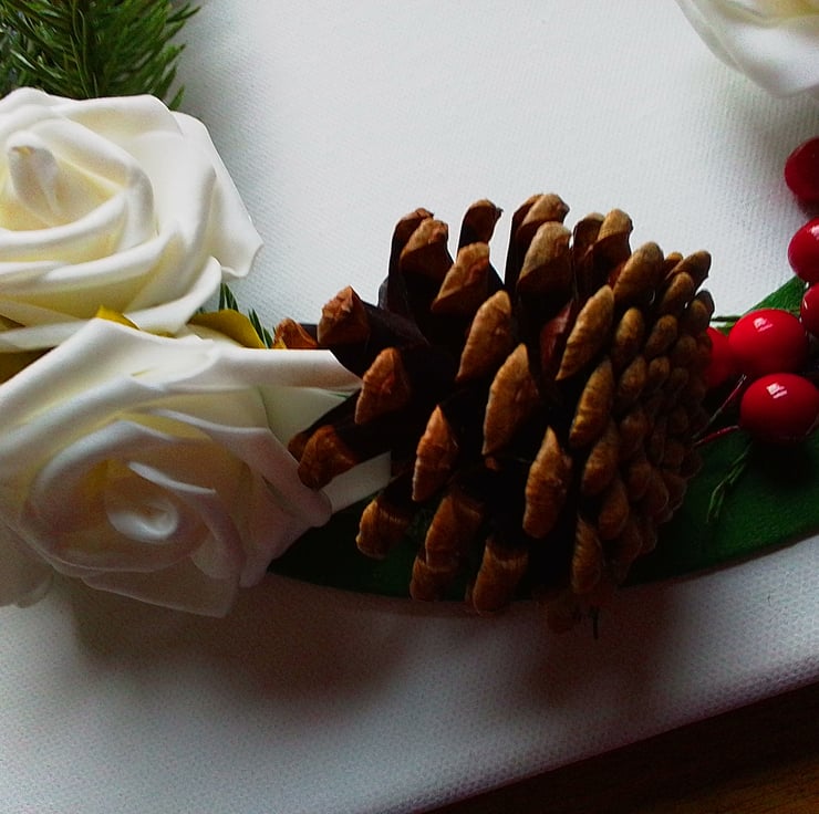 A pretty Christmas wreath with faux greenery, silk white flowers, pine. One and berries.