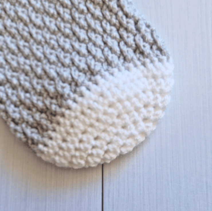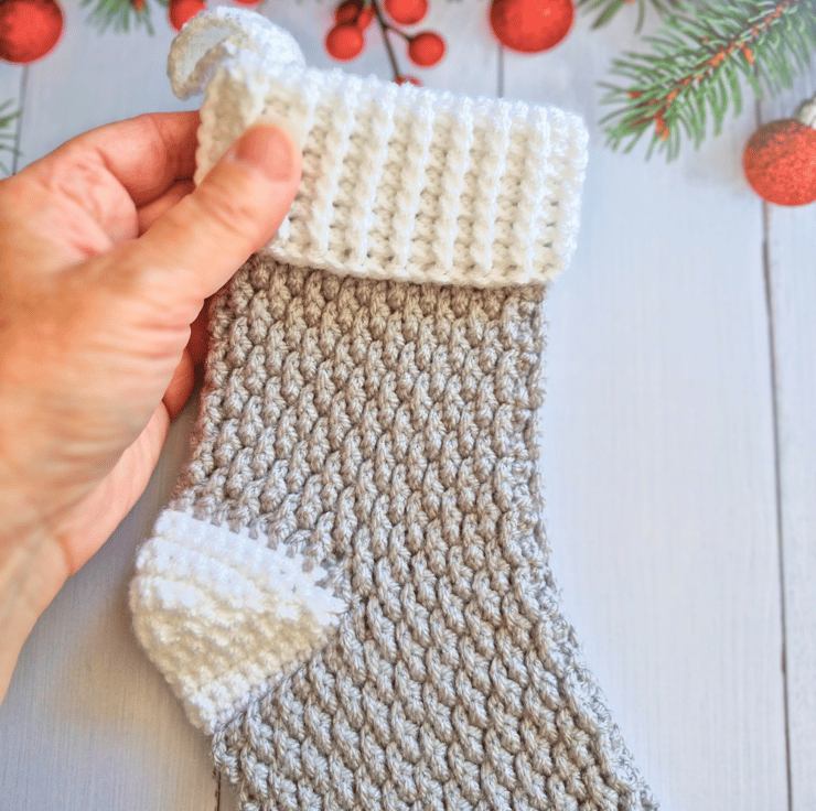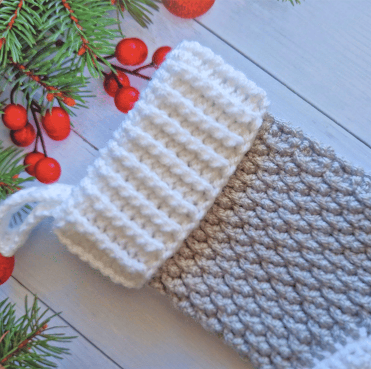 Crocheted in a textured stitch, the stocking features a soft ribbed cuff in white, also with white heel and toe detail. A built-in hanging loop makes it easy to display wherever you like.
