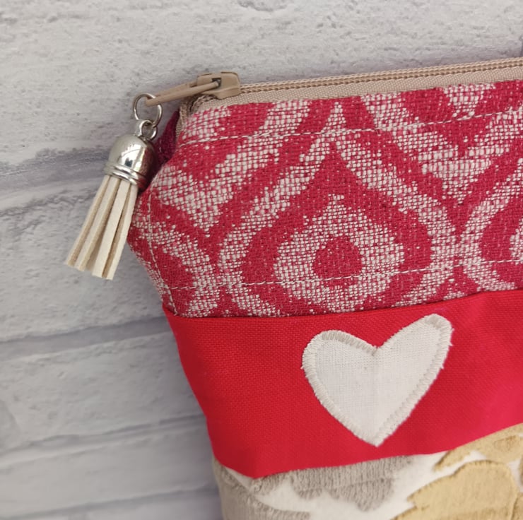 This toiletry bag is made using off cuts from various upholstery fabric and a small piece of cotton fabric. The back is a plain upholstery fabric colour. Lined with cotton fabric and finished off with a cute leather tassle on the zipper pull. Sewn on the inside is one of my printed labels.