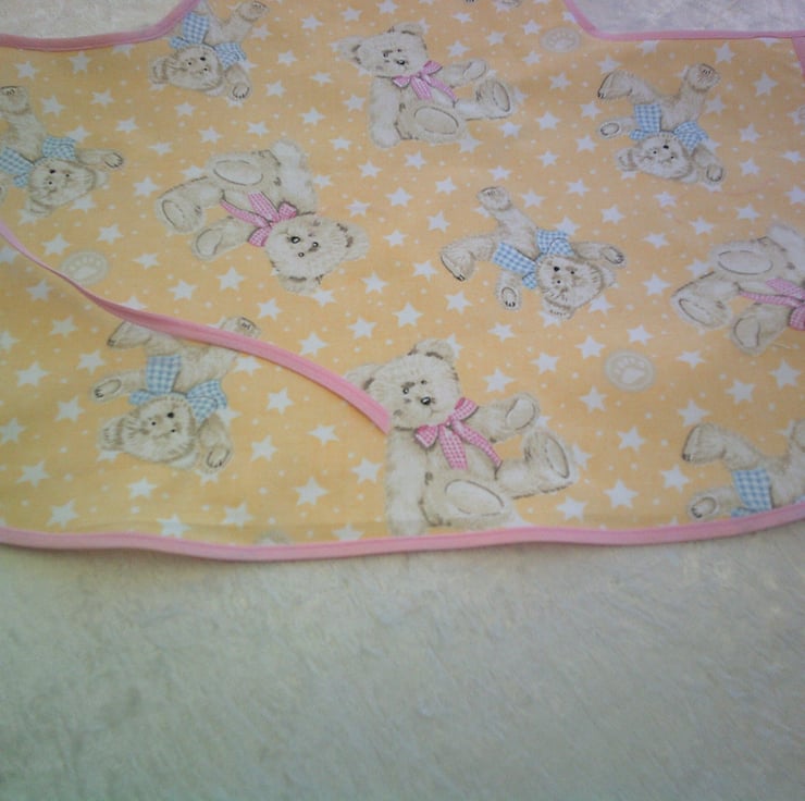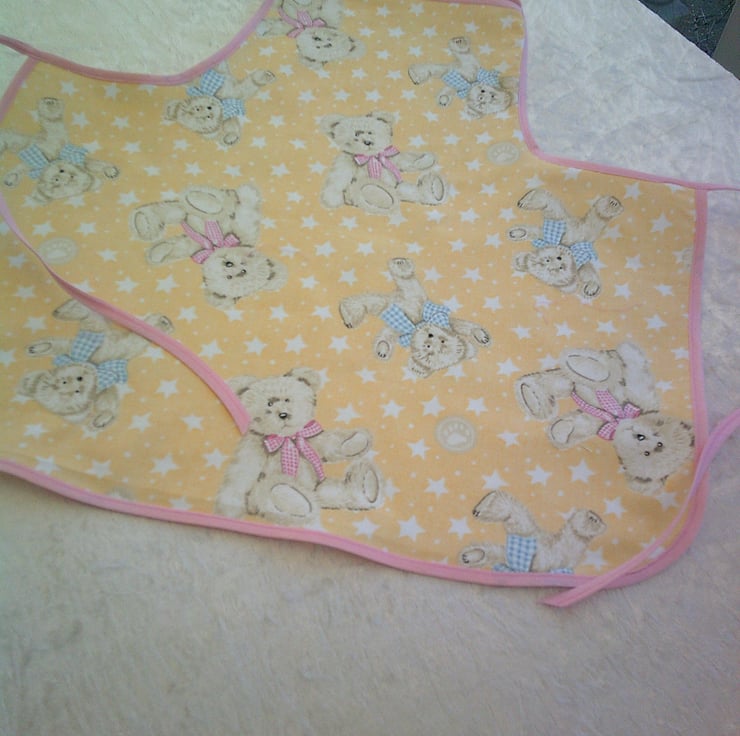 The fabric used has a design of Teddy Bears wearing blue and pink bows and stars on a yellow background and is edged with a contrasting pink bias binding.