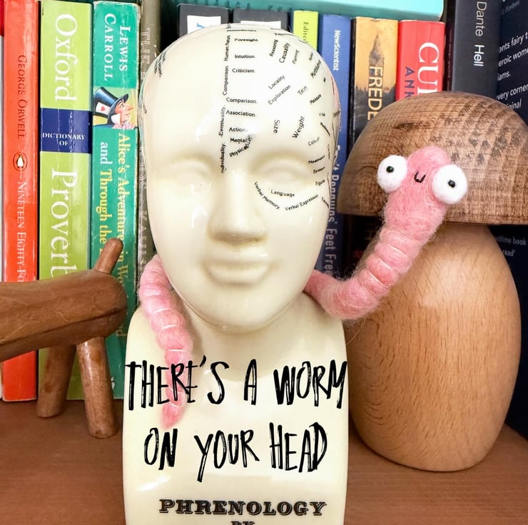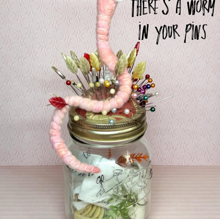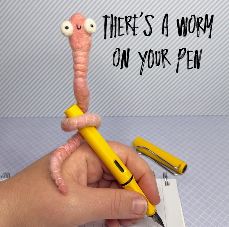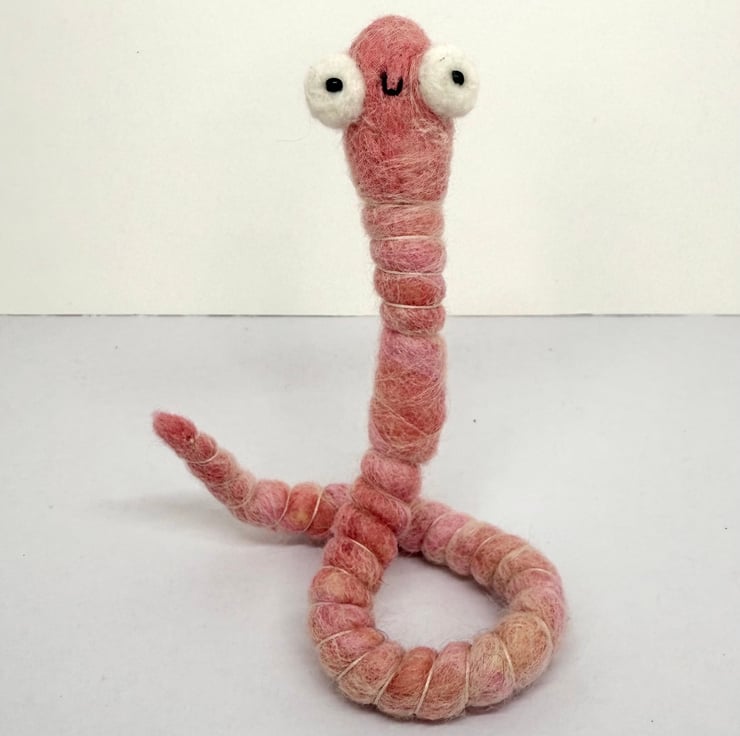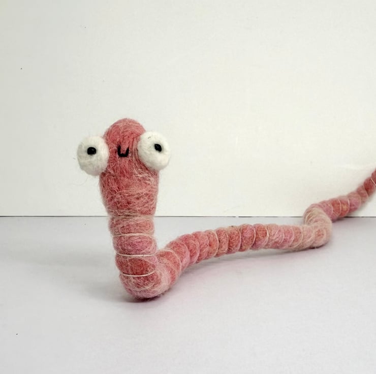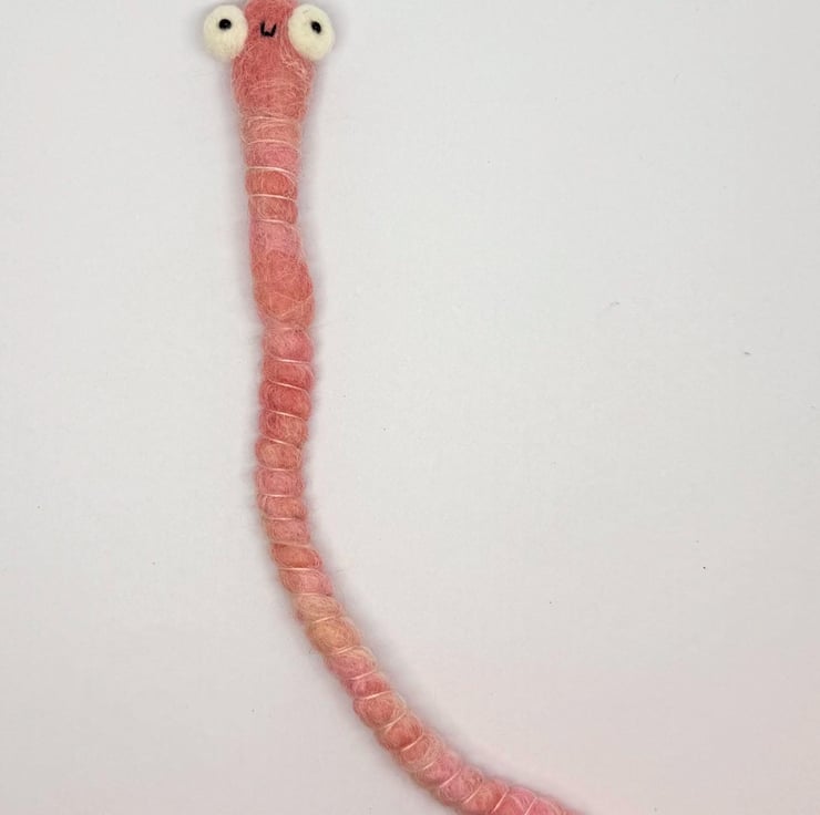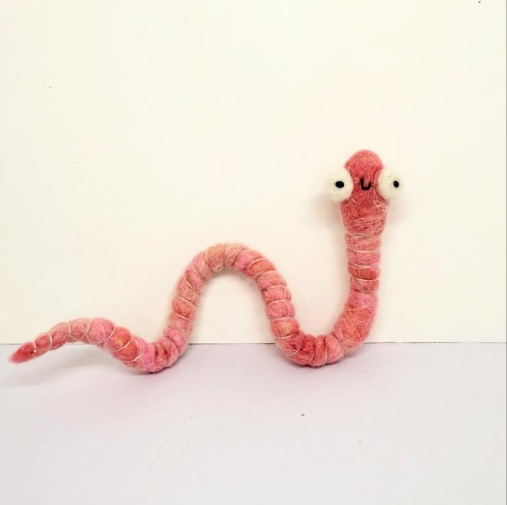 Decorative wired worm needlefelted with hand dyed wool. This worm has big eyes with glass beads pupils pointing forwards. The worm has pink thread around the body and can be gently twisted and posed into many positions. Worm measures roughly 22cm long.