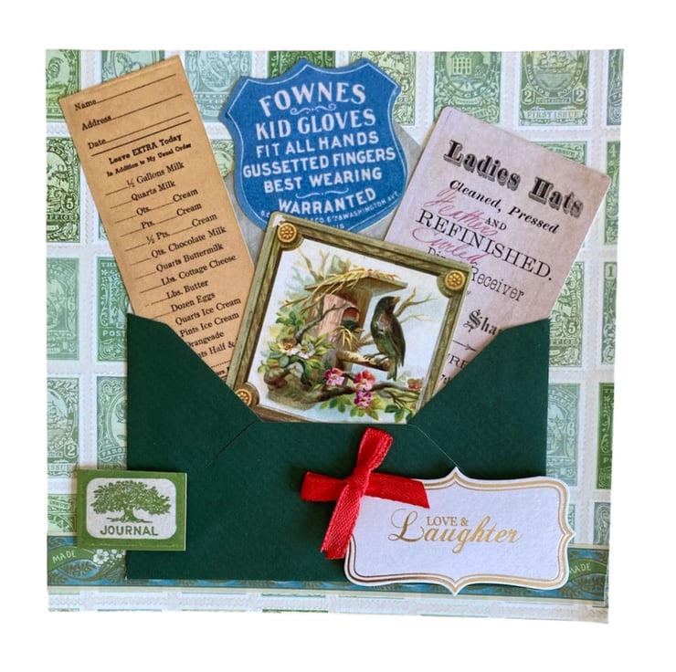 The ivory base card has been layered with paper printed featuring postage stamps. A little green envelope has been added which is filled with flea market inspired ephemera. The sentiment Love and Laughter has been added.